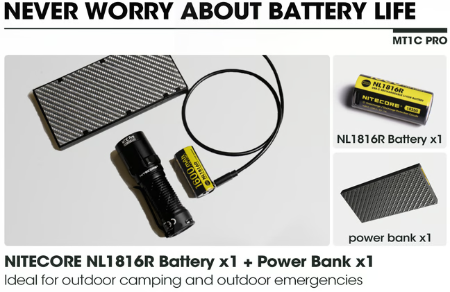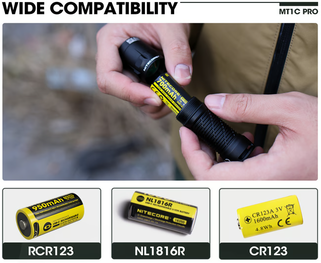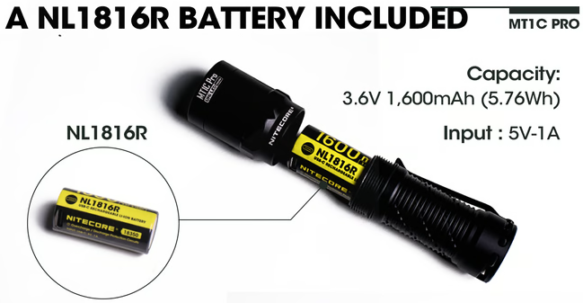 Η χρήση του εξασφαλίζει καθαρή και ισχυρή δέσμη φωτός, προσφέροντας αξιοπιστία και άνεση. Μπορεί να λειτουργήσει με την επαναφορτιζόμενη μπαταρία USB-C Nitecore NL1816R, η οποία περιλαμβάνεται, μια μη επαναφορτιζόμενη μπαταρία CR123 (δεν περιλαμβάνεται) ή μια επαναφορτιζόμενη μπαταρία RCR123 (δεν περιλαμβάνεται). Με την μπαταρία NL1816R, ο φακός μπορεί να λειτουργήσει έως και 15 ώρες στη χαμηλότερη λειτουργία πριν χρειαστεί επαναφόρτιση, προσφέροντας μεγάλη διάρκεια λειτουργίας για τις πιο απαιτητικές καταστάσεις.
