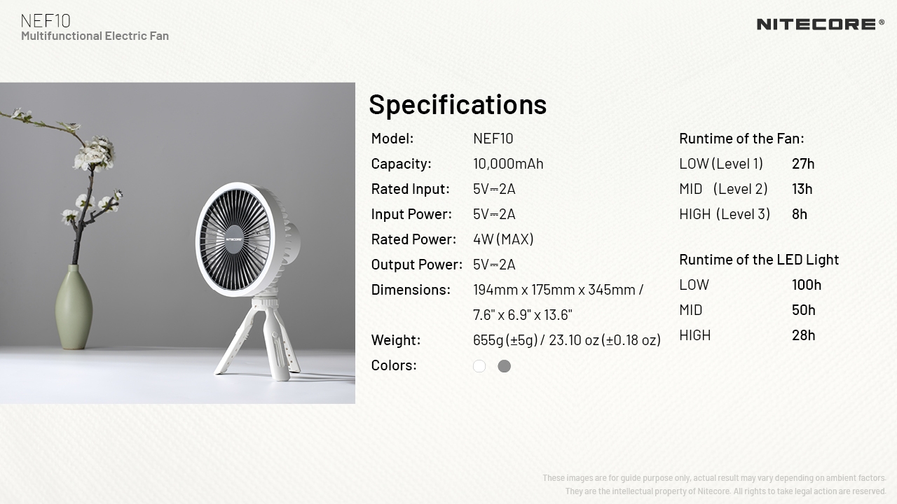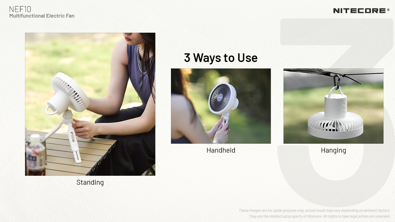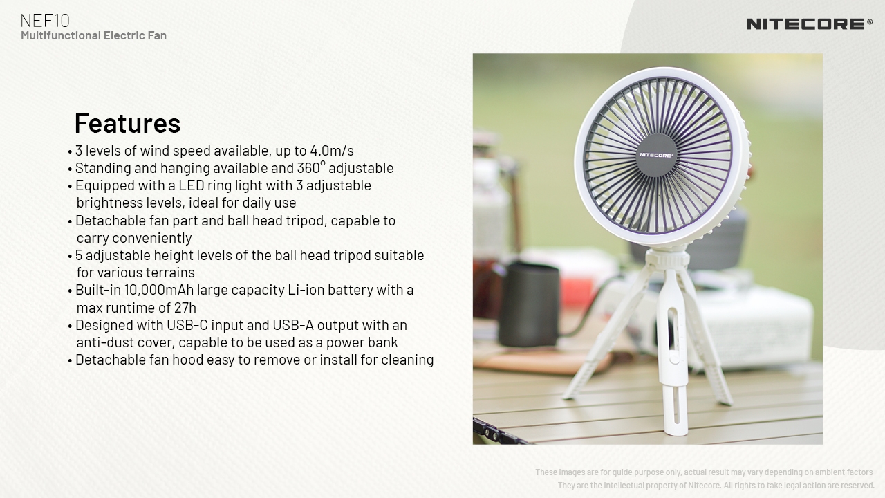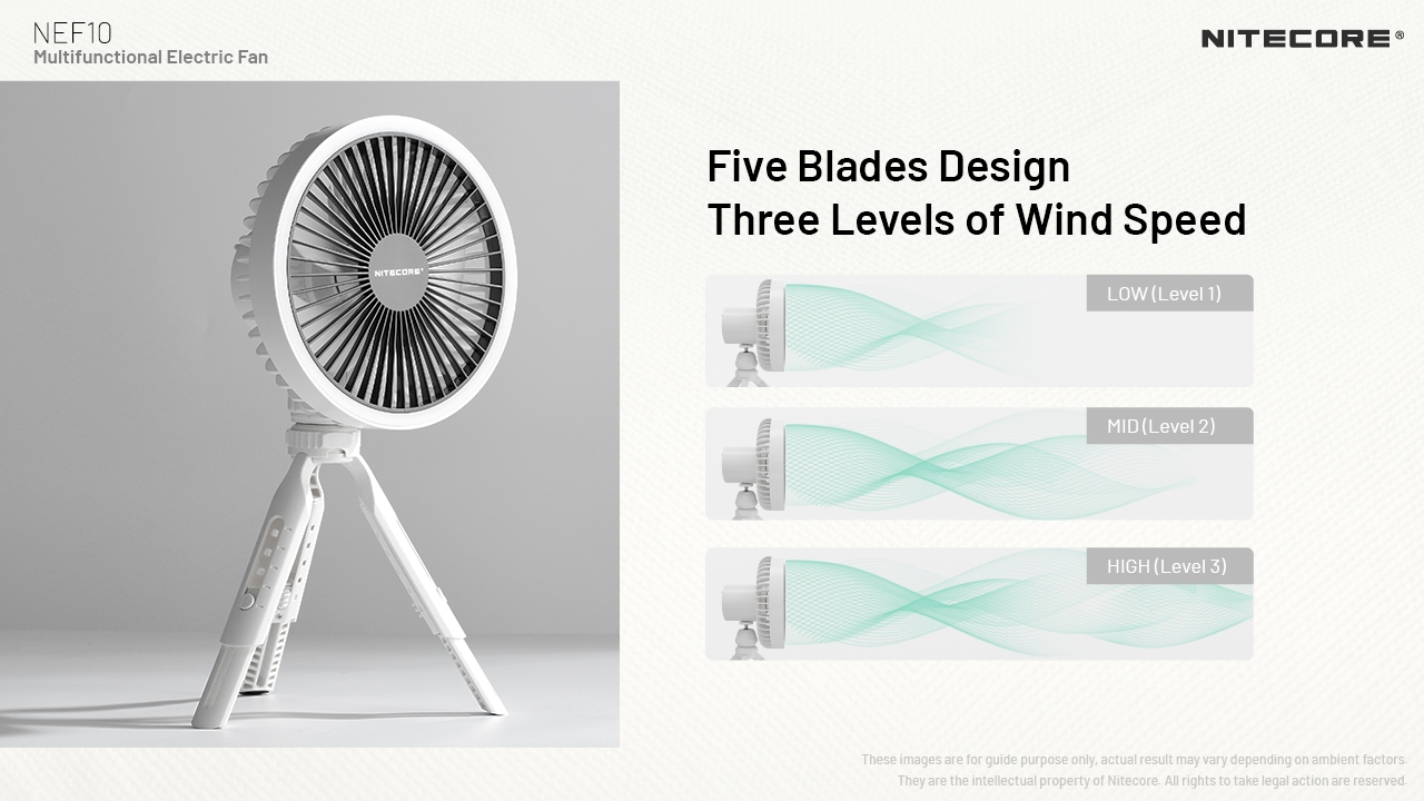 Ο NEF10 της Nitecore είναι ένας πολυχρηστικός ηλεκτρικός ανεμιστήρας, οποίος κρατιέται, κρεμιέται και στέκεται! Διαθέτει μπαταρία 10.000mAh, φωτισμό LED και είναι σχεδιασμένος με πέντε λεπίδες και τρία επίπεδα ταχύτητας αέρα, χαμηλής, μεσαίας και υψηλής έντασης.