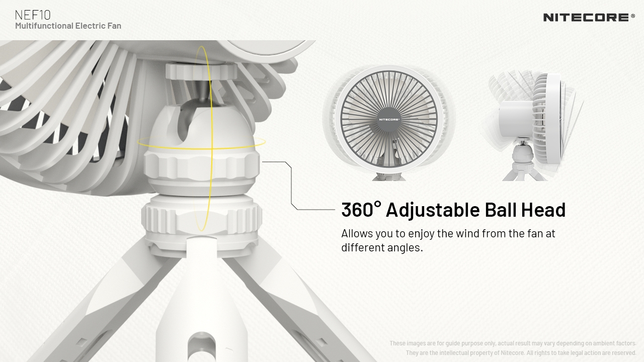 Διαθέτει ένα ευέλικτο τρίποδο με σφαιρική κεφαλή, με πόδια που ρυθμίζονται κατά το ύψος σε πέντε επίπεδα και παράλληλα μπορούν να σταθεροποιηθούν στην επιθυμητή γωνία ώστε το NEF10 να προσαρμόζεται σε διάφορα πεδία. Η ρυθμιζόμενη σφαιρική κεφαλή κατά 360° σας επιτρέπει να απολαύσετε τον αέρα του ανεμιστήρα από την γωνία που επιθυμείτε.