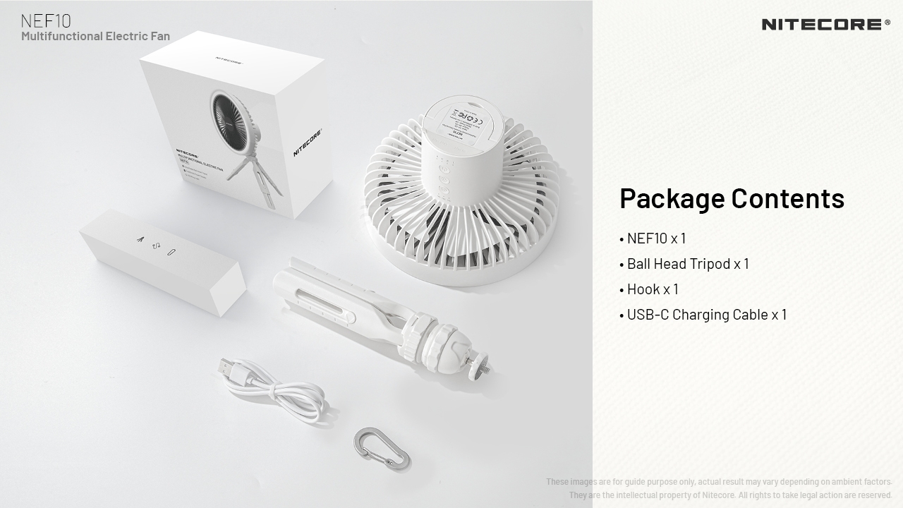 Η συσκευασία περιλαμβάνει: 1 x Ανεμιστήρα NEF10, 1 x Τρίποδο, 1 x Γάντζο, 1 x Καλώδιο USB σε Type-C.