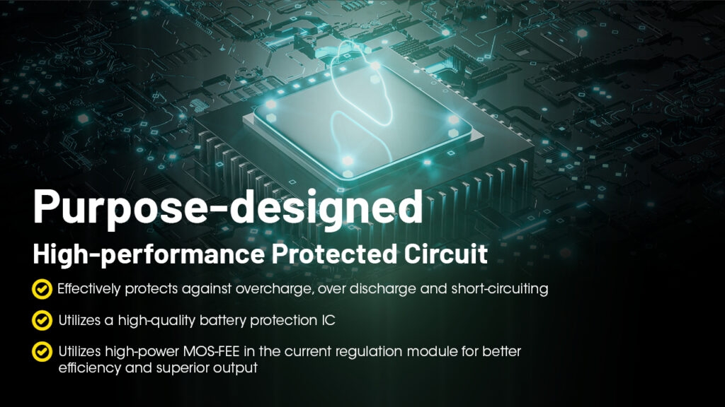 Το ειδικά σχεδιασμένο, υψηλής απόδοσης ηλεκτρονικό κύκλωμα προστασίας, προστατεύει αποτελεσματικά από υπερβολική φόρτιση, υπερβολική αποφόρτιση και βραχυκύκλωμα. Επίσης, ενσωματώνει ένα υψηλής ποιότητας κύκλωμα προστασίας της μπαταρίας και ένα υψηλής ενέργειας MOS-FEE στην μονάδα ρύθμισης του ρεύματος, για μεγαλύτερη αποδοτικότητα και εξαιρετική απόδοση.