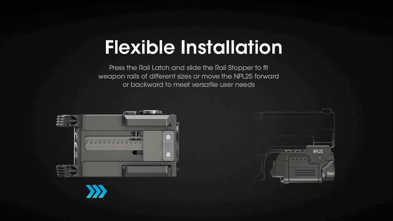 Μπορεί να τοποθετηθεί άμεσα στην ράγα από ένα πιστόλι Glock και μπορεί να προσαρμοστεί και σε ράγα Picatinny (MIL-STD-1913) τοποθετώντας έναν αντάπτορα για τις ράγες αυτές. Εσείς απλά πιέστε το μάνταλο της ράγας και σύρετε το φρένο ράγας ώστε να ταιριάζει στις εγκοπές της ράγας του όπλου σας ή για να μετακινηθεί ο φακός NPL25 προς τα εμπρός ή προς τα πίσω ώστε να εξυπηρετεί απόλυτα τις ανάγκες σας.