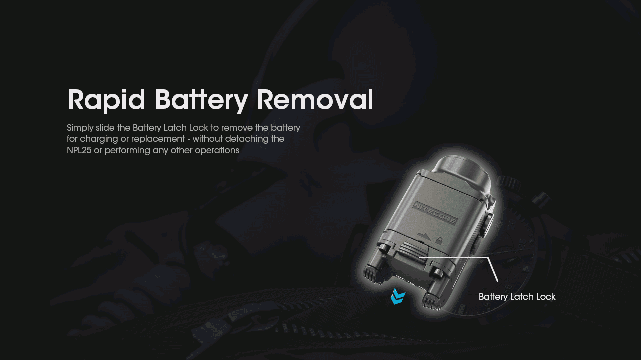 Διαθέτει προηγμένο σύστημα ταχείας αφαίρεσης της μπαταρίας, επιτρέποντας τη γρήγορη αντικατάστασή της χωρίς να χρειάζεται να αφαιρεθεί ο φακός από το όπλο. Η μπαταρία ιόντων λιθίου 500mAh με μαγνητική φόρτιση εξασφαλίζει άμεση επαναφόρτιση, ενώ οι ενδεικτικές λυχνίες ισχύος σας ενημερώνουν για το υπόλοιπο ενέργειας.