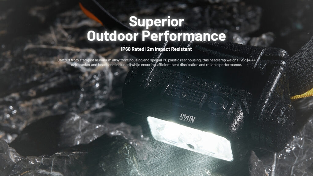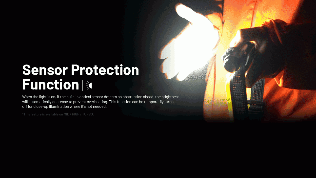 Κατασκευασμένος από χυτό κράμα αλουμινίου και ειδικό πλαστικό PC, αυτός ο φακός έχει βαθμολογία IP68 και είναι ανθεκτικός σε πτώσεις από 2 μέτρα ύψος. Χάρη στην έξυπνη προστασία αισθητήρων, γίνεται αυτόματος έλεγχος της φωτεινότητας για αποφυγή υπερθέρμανσης όταν ανιχνεύεται εμπόδιο μπροστά από τον φακό. Αυτή η λειτουργία μπορεί να απενεργοποιηθεί προσωρινά για φωτισμό σε κοντινή απόσταση όπου δεν είναι απαραίτητη. Είναι διαθέσιμη στις εντάσεις φωτισμού, μεσαία (Mid), υψηλή (High) και Turbo.