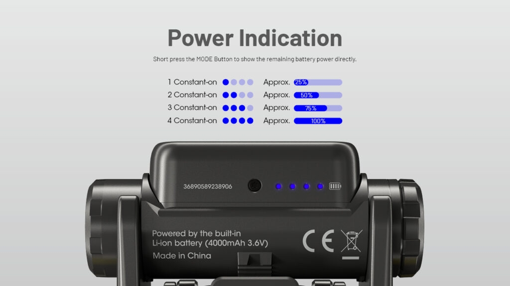 Η μέγιστη ισχύς φωτισμού φθάνει τα 1700 Lumens, φωτίζοντας αποτελεσματικά έως και 172 μέτρα μακριά. Οι πολλαπλοί πυρήνες LED προσφέρουν υψηλή απόδοση φωτισμού με βελτιωμένη διαχείριση θερμότητας και χαμηλότερη κατανάλωση ενέργειας, επιτρέποντας παρατεταμένη χρήση. Η ενσωματωμένη μπαταρία 18650/4000mAh με μεγάλη ενεργειακή πυκνότητα 300mWh/g, εξασφαλίζει ενέργεια μεγάλης διάρκειας, προσφέροντας 8 ώρες, διάρκεια λειτουργίας στην υψηλή ένταση (High), 17 ώρες διάρκεια λειτουργίας στην μεσαία ένταση (Mid), 34 ώρες διάρκεια λειτουργίας στην χαμηλή ένταση (Low).