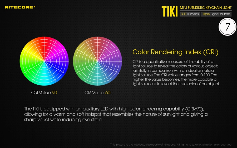 Το βοηθητικό λευκό LED υψηλού CRi που διαθέτει ο TIKI έχει την δυνατότητα να αποκαλύπτει το πραγματικό χρώμα των αντικειμένων που φωτίζει και είναι ιδανικό για φωτισμό σε κοντινή απόσταση όπως για παράδειγμα στο Camping ή το νυχτερινό διάβασμα. Το CRi είναι μία ποσοτική μέτρηση της ικανότητας μία πηγής φωτισμού να αποκαλύπτει τα χρώματα διαφόρων αντικειμένων με πιστότητα σε σύγκριση με το φυσικό ημερήσιο φως.