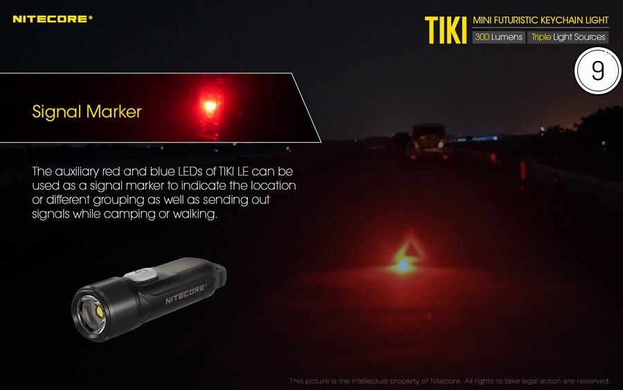 Το βοηθητικό υπεριώδες LED (500mW, 365nm) του TIKI έχει την δυνατότητα να διεγείρει τον φθορισμό σε αντικείμενα και μπορεί να χρησιμοποιηθεί ως ανιχνευτής πλαστών χαρτονομισμάτων και πλαστών εγγράφων, ως ελεγκτής φθοριζόντων χημικών, ως ενεργοποιητής φωσφοριζόντων υλικών ή ως φως που ελκύει έντομα. Όταν ο φακός είναι απενεργοποιημένος, πατήστε και κρατήστε πατημένο τον διακόπτη και θα μεταβείτε άμεσα στο πιο ισχυρό επίπεδο φωτισμού του κύριου LED.