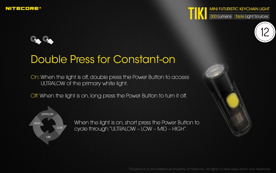 Όταν ο φακός είναι απενεργοποιημένος, με διπλό πάτημα του διακόπτη το κεντρικό LED ανάβει στον πιο χαμηλό φωτισμό. Όταν ο φακός είναι ενεργοποιημένος, παρατεταμένο πάτημα του διακόπτη και ο φακός απενεργοποιείται. Όταν ο φακός είναι ενεργοποιημένος, σύντομα πατήματα του διακόπτη αλλάζουν την ένταση φωτισμού με την σειρά "Πολύ Χαμηλό-Χαμηλό-Μεσαίο-Turbo". Ο σχεδιασμός για ενεργοποίηση με διπλό πάτημα του διακόπτη, προστατεύει αποτελεσματικά από ατυχή ενεργοποίηση.