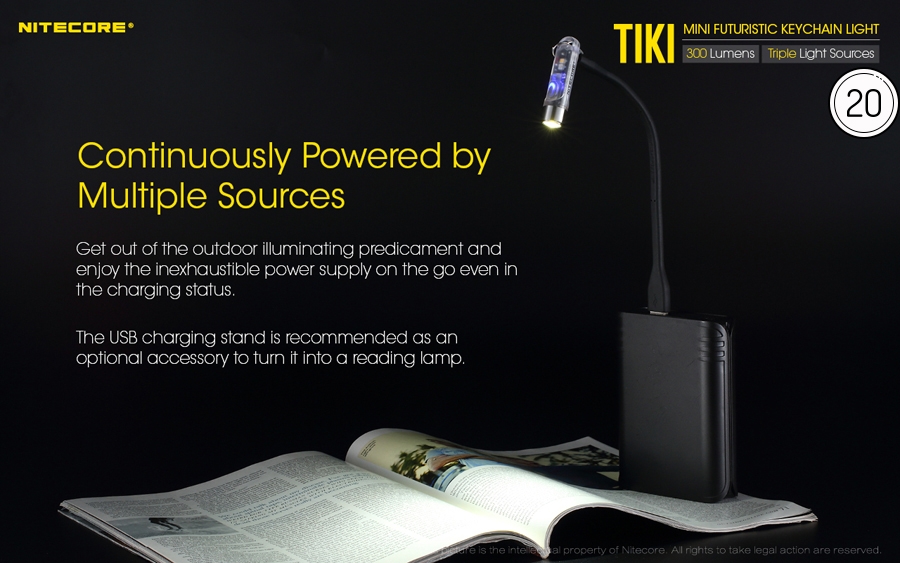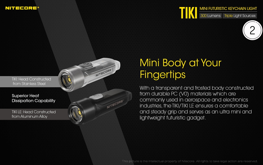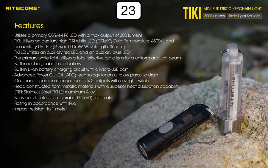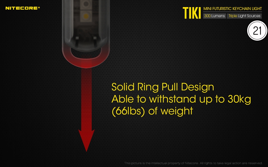Ο μικρός φακός TIKI της Nitecore για τα κλειδιά νέας σχεδίασης, εξαιρετικά ελαφρύς 10g, επαναφορτιζόμενος από USB, πολύ ισχυρός 300 Lumens! Mε τρεις (3) διαφορετικές πηγές φωτισμού. Κατασκευασμένα από ανθεκτικά πολυκαρβονικά υλικά (PC V0) που χρησιμοποιούνται κυρίως στην αεροναυπηγική βιομηχανία και την βιομηχανία ηλεκτρονικών, το TIKI εξασφαλίζει άνετο και σταθερό κράτημα και λειτουργούν ως πολύ μικρά και ελαφριά φουτουριστικά γκάτζετ.