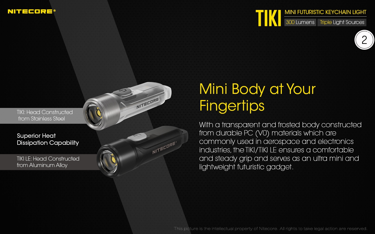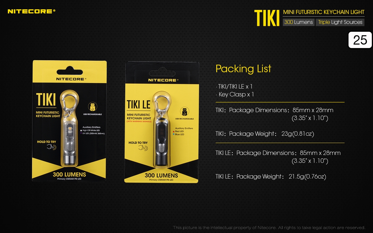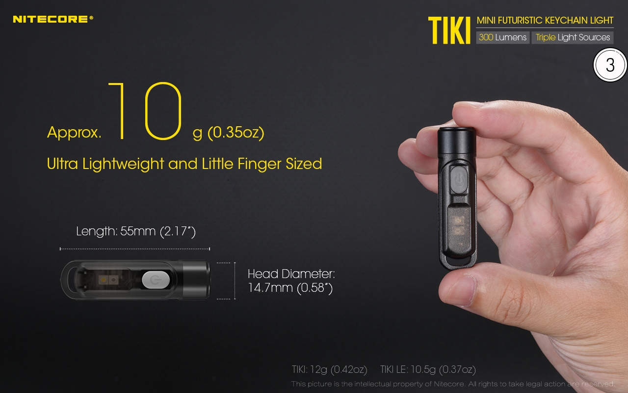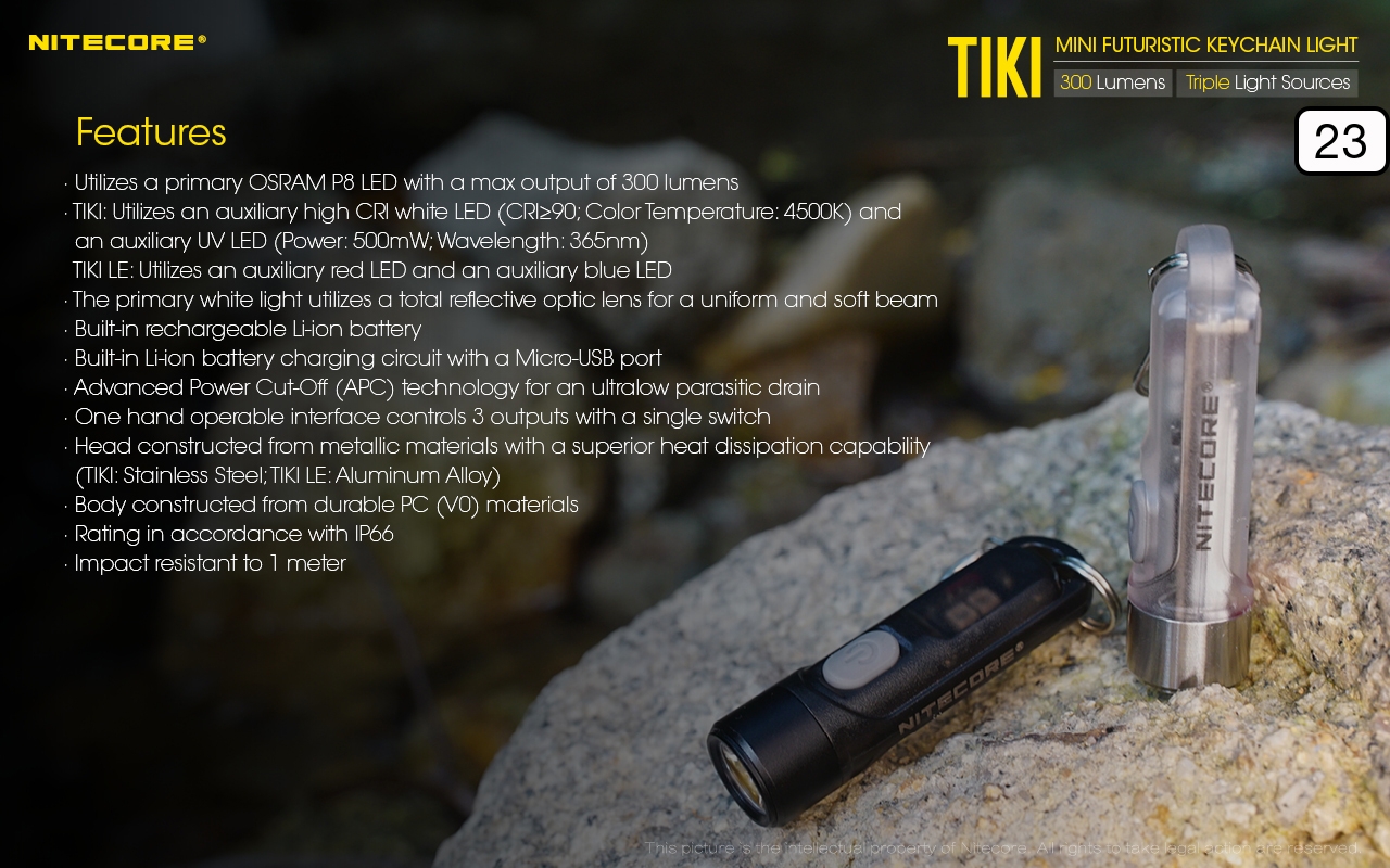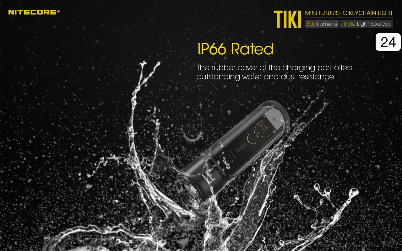 Ο μικρός φακός TIKI LE της Nitecore για τα κλειδιά νέας σχεδίασης, εξαιρετικά ελαφρύς 10g, επαναφορτιζόμενος από USB, πολύ ισχυρός 300 Lumens! Mε τρεις (3) διαφορετικές πηγές φωτισμού. Κατασκευασμένα από ανθεκτικά πολυκαρβονικά υλικά (PC V0) που χρησιμοποιούνται κυρίως στην αεροναυπηγική βιομηχανία και την βιομηχανία ηλεκτρονικών, το TIKI εξασφαλίζει άνετο και σταθερό κράτημα και λειτουργούν ως πολύ μικρά και ελαφριά φουτουριστικά γκάτζετ.
