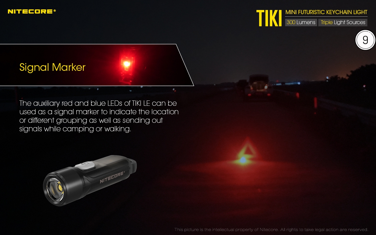 Το βοηθητικό LED κόκκινου φωτισμού του TIKI LE μπορεί να χρησιμοποιηθεί ως προειδοποιητικός φωτισμός κατάδειξης θέσης ή ως φωτισμός αναγνώρισης ομάδας ή ως φωτισμός για αποστολή σημάτων κατά την διάρκεια περιπάτων ή κατασκήνωσης. Η λειτουργία Προειδοποιητικού Αναβοσβήματος με εναλλαγή του Κόκκινου και του Μπλε φωτισμού που διαθέτει ο TIKI LE μπορεί να χρησιμοποιηθεί για την εκπομπή προειδοποιητικού σήματος σε οχήματα που πλησιάζουν ή σε πεζούς για την αποφυγή πιθανών κινδύνων.