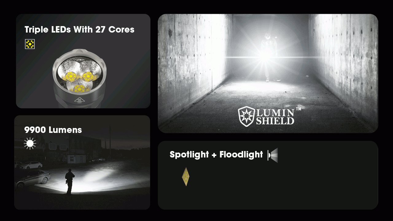 Διαθέτοντας υψηλή πυκνότητα φωτός και υψηλή ένταση δέσμης, το UHi LED χρησιμοποιεί τη στρογγυλή επιφάνεια εκπομπής φωτός (LES) και ξεκινά μια νέα εποχή του φακού LED. Με τον επαναστατικό σχεδιασμό της UHi LED, προσφέρει υψηλή πυκνότητα φωτός και ανώτερη ένταση δέσμης, ανοίγοντας ένα νέο κεφάλαιο στην ιστορία των LED φακών. Με τη λειτουργία Lumin Shield, ο φακός μετατρέπεται σε μια προστατευτική ασπίδα φωτός, παρέχοντας ισχυρή άμυνα από επιθέσεις.