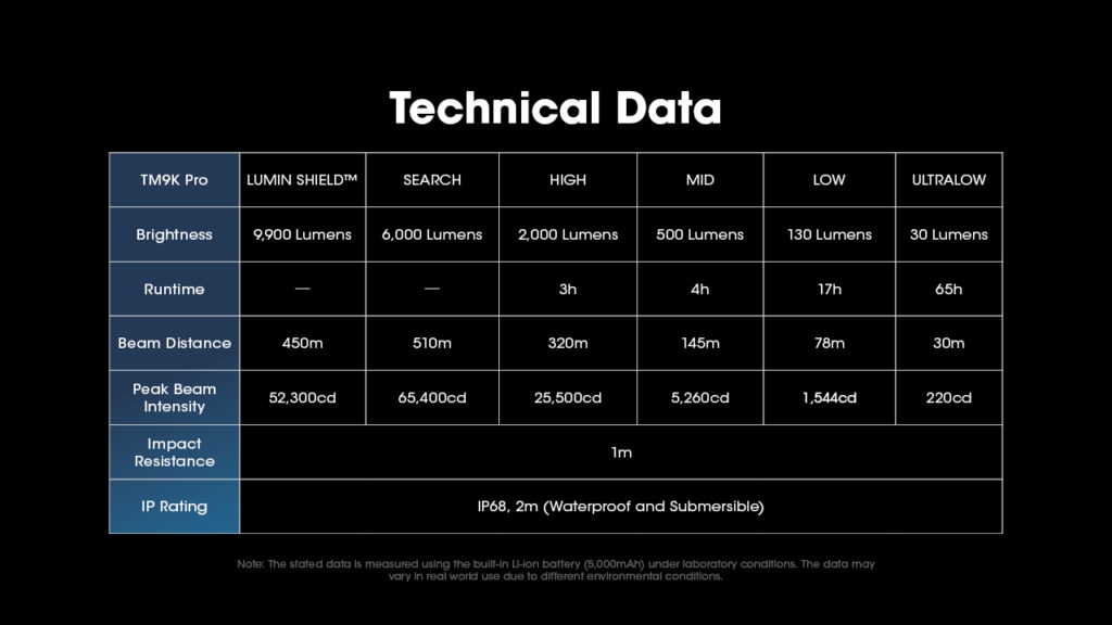 Ο σχεδιασμός του TM9K Pro ενσωματώνει επίσης πρωτοποριακές λειτουργίες ασφαλείας, όπως η λειτουργία προστασίας αισθητήρα και οι δύο λειτουργίες κλειδώματος, εξασφαλίζοντας όχι μόνο υψηλή απόδοση αλλά και ασφάλεια κατά τη χρήση. Πιο αναλυτικά, εκτός από τη λειτουργία Full Lockout, πατήστε και κρατήστε πατημένο το κουμπί Mode για να ενεργοποιήσετε το Lumin Shield για να δημιουργήσετε μια απίστευτη απόδοση 9900 Lumens, που χρησιμεύει ως προστατευτική ασπίδα φωτός που προσφέρει ισχυρή άμυνα από επιθέσεις.