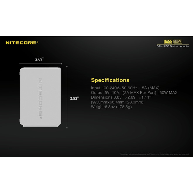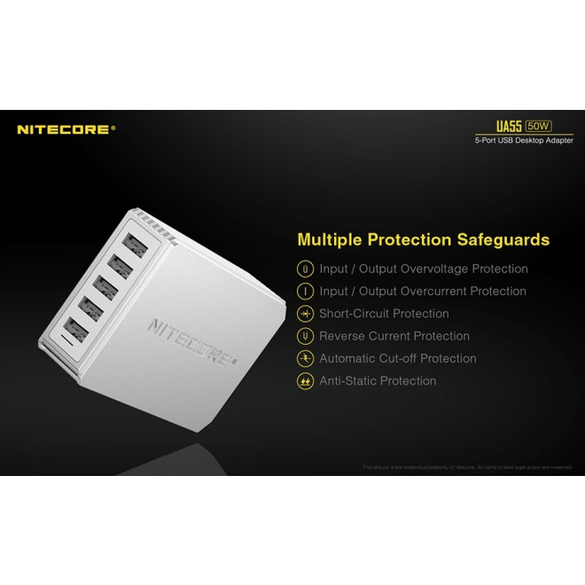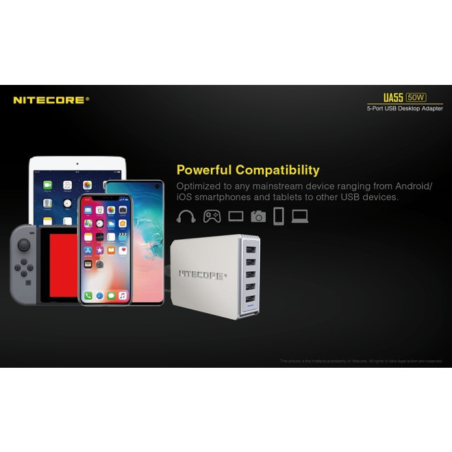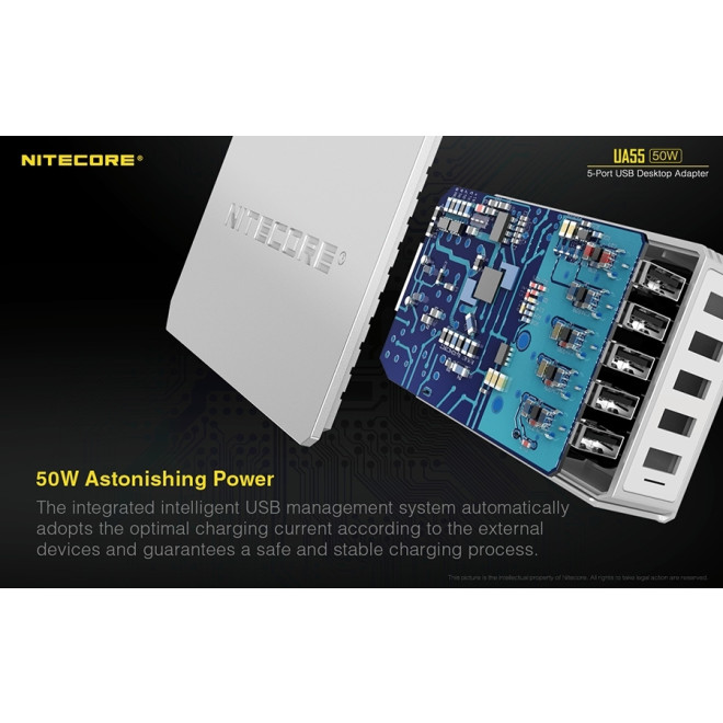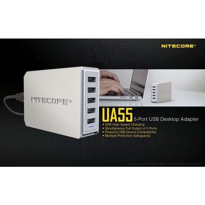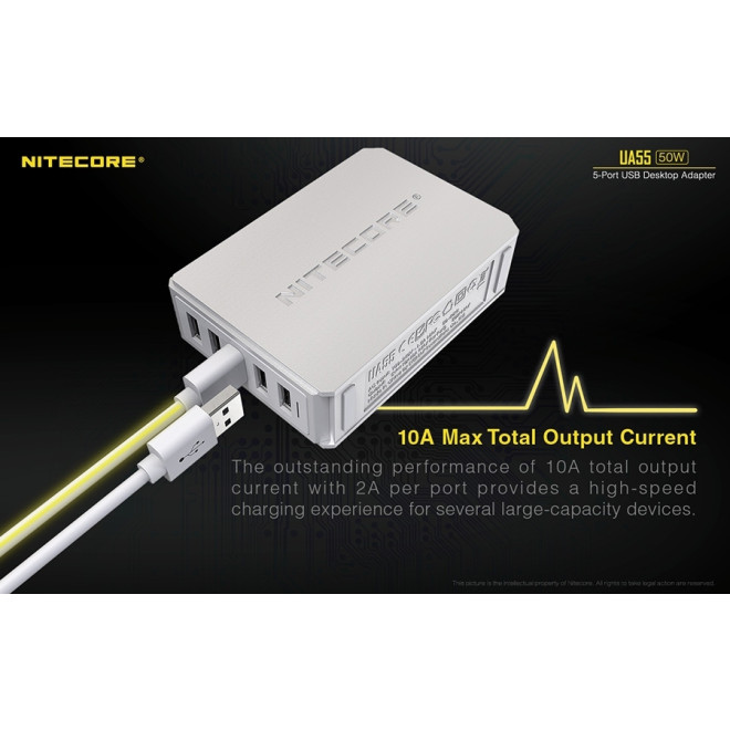 Ο επιτραπέζιος αντάπτορας UA55 της Nitecore διαθέτει πέντε θύρες USB-A και αποτελεί την απόλυτη λύση για την ταυτόχρονη φόρτιση πολλαπλών συσκευών με εξαιρετική ταχύτητα και αξιοπιστία. Με συνολική ισχύ 50W, προσφέρει γρήγορη και ασφαλή φόρτιση εξασφαλίζοντας την αποτελεσματική απόδοση ακόμα και σε συσκευές με μεγάλη χωρητικότητα.