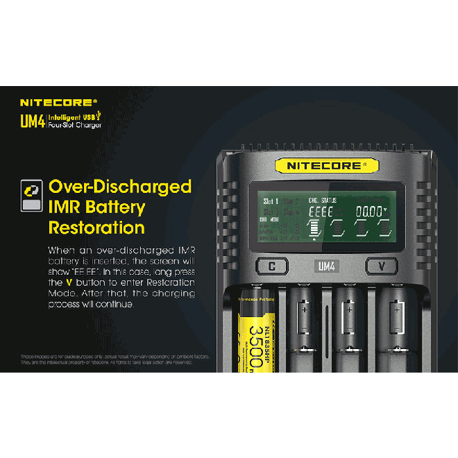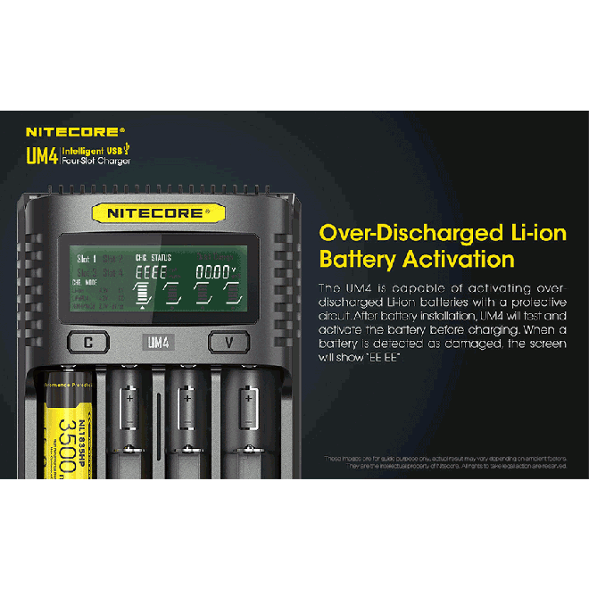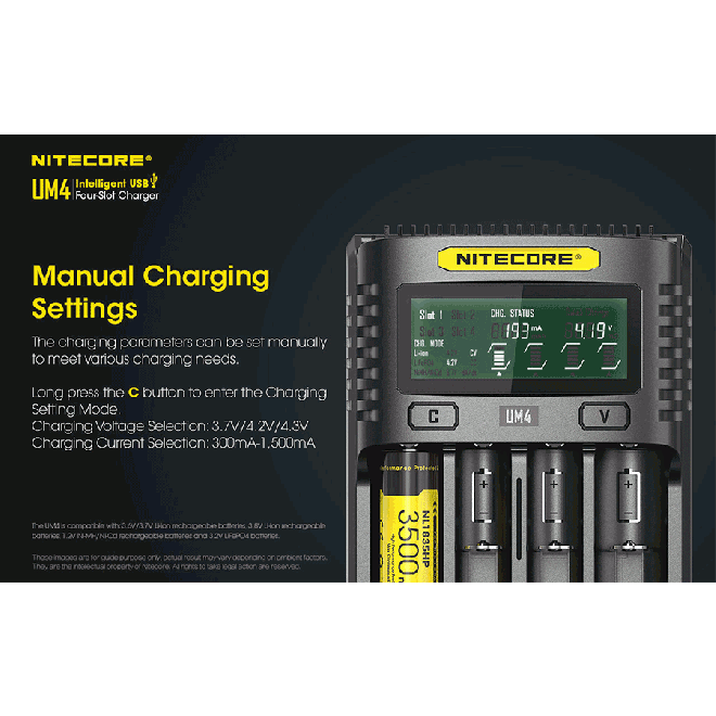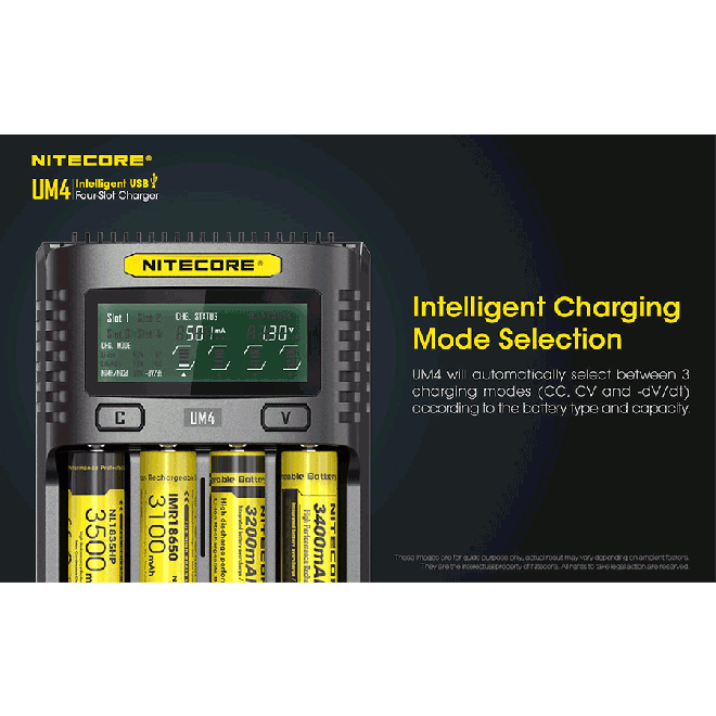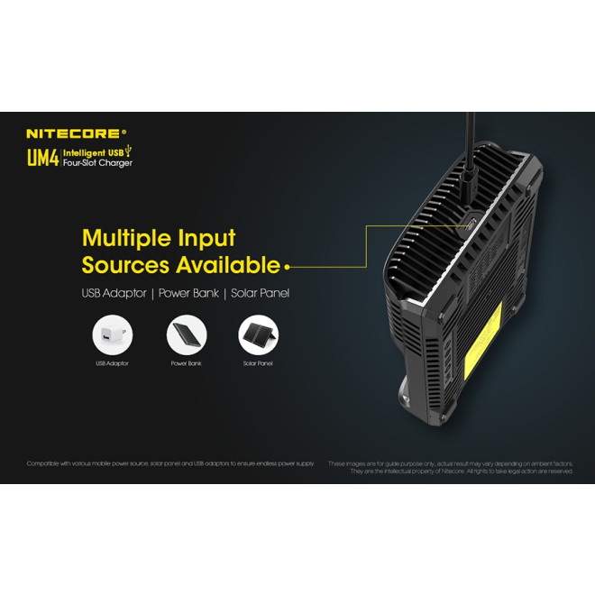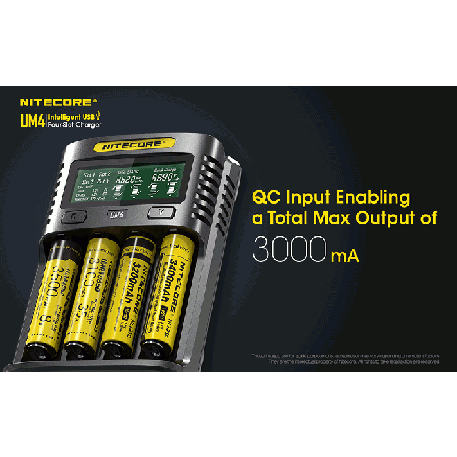 Ο UM4 της Nitecore είναι ένας έξυπνος φορτιστής τεσσάρων θέσεων με δυνατότητα γρήγορης φόρτισης (QC), συνολικό μέγιστο ρεύμα φόρτισης τα 3000mA (QC) και μέγιστο ρεύμα φόρτισης σε μία μόνο θέση που μπορεί να φθάσει τα 1500mA.