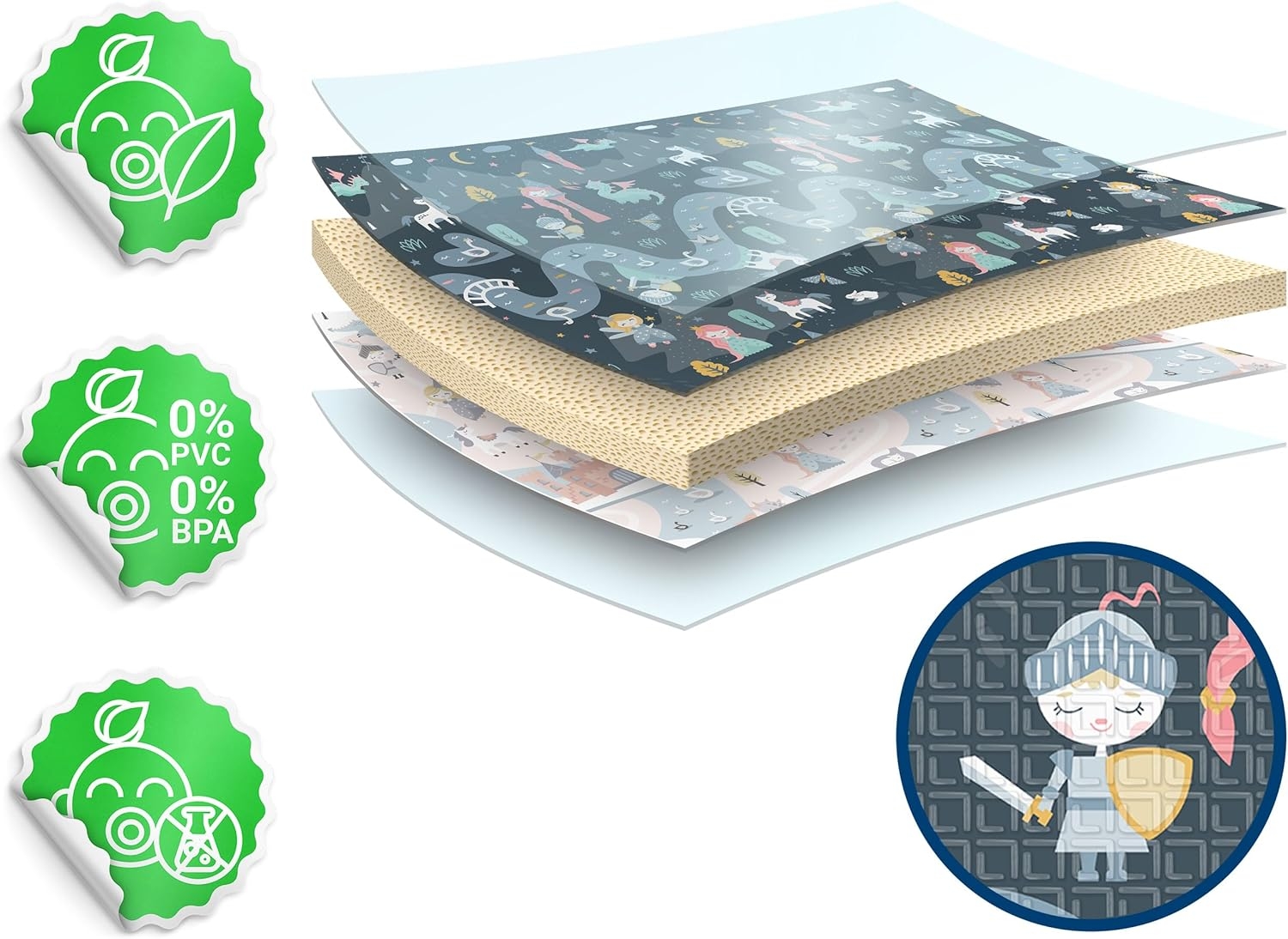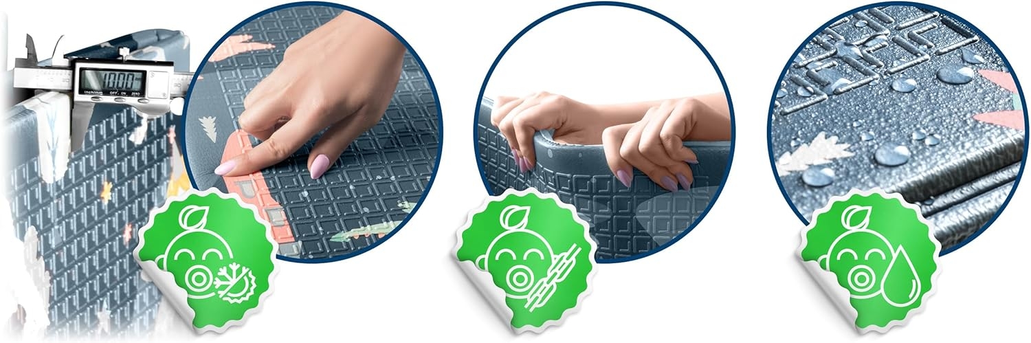 Το χαλάκι αυτό είναι ιδανικό την ασφάλεια των παιδιών, καθώς δεν περιέχει δισφαινόλη Α (BPA), PVC, φθαλικές ενώσεις ή φορμαμίδιο. Πληροί τα αυστηρά ευρωπαϊκά πρότυπα ασφαλείας, ενώ διαθέτει το Ευρωπαϊκό Πιστοποιητικό CE και έχει περάσει τις δοκιμές EN71-1, EN71-2 και EN71-3. Είναι επίσης τέλειο για παιδιά με ευαισθησίες ή αλλεργίες, καθώς δεν μαζεύει σκόνη ή ακάρεα.