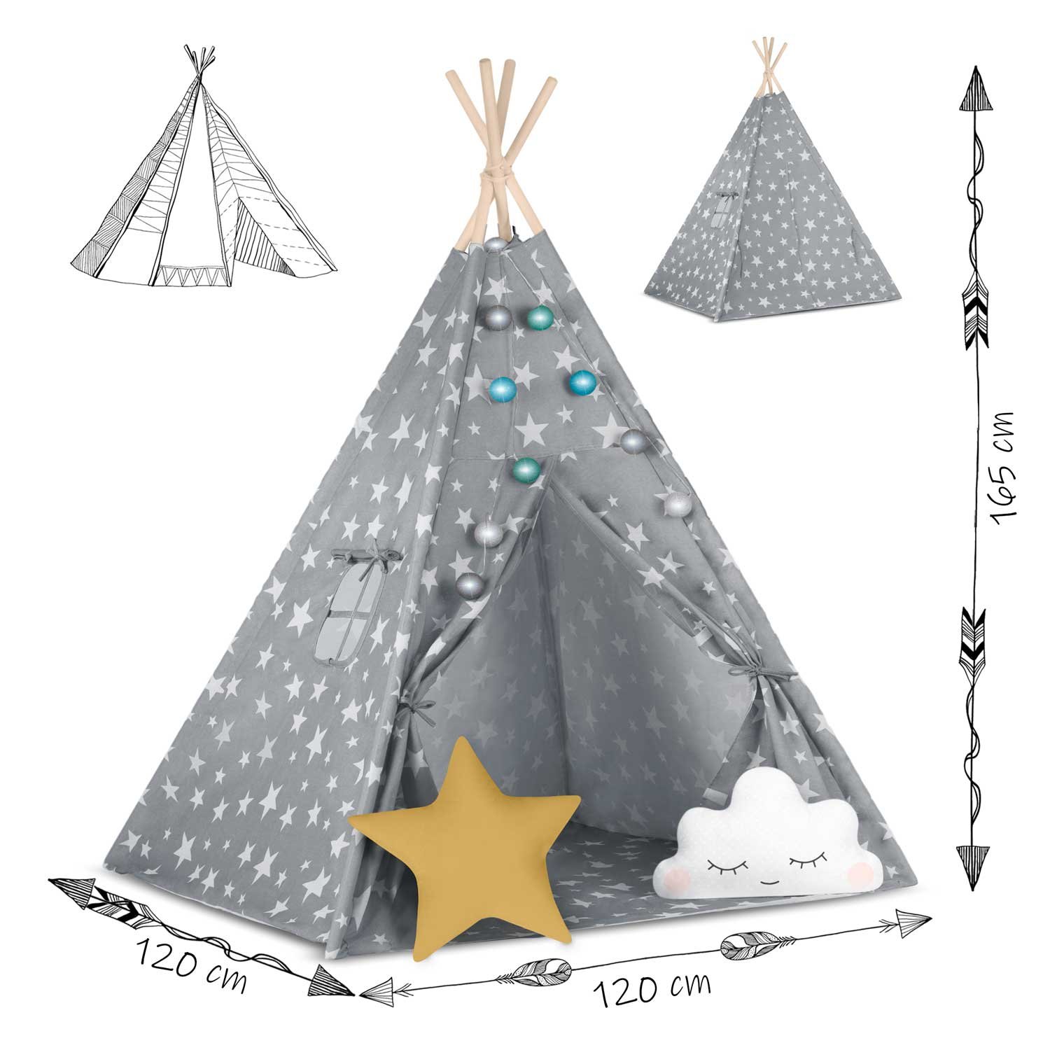 Το χαλάκι προσφέρει ζεστασιά και άνεση, ενώ τα δύο αφράτα μαξιλάρια κάνουν το tipi ακόμα πιο φιλόξενο. Η σκηνή είναι κατασκευασμένη από βαμβάκι υψηλής ποιότητας, το οποίο επιτρέπει στον αέρα να κυκλοφορεί, ενώ το ύφασμα είναι εξαιρετικά απαλό και ιδανικό για πολλές ώρες παιχνιδιού!