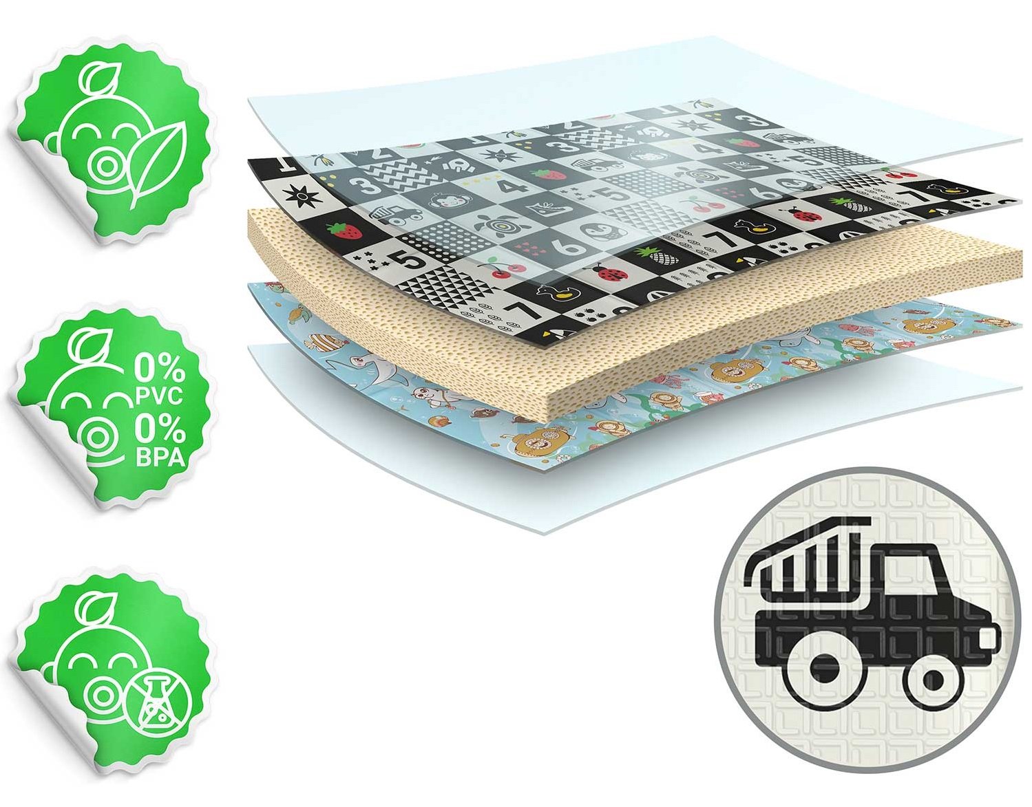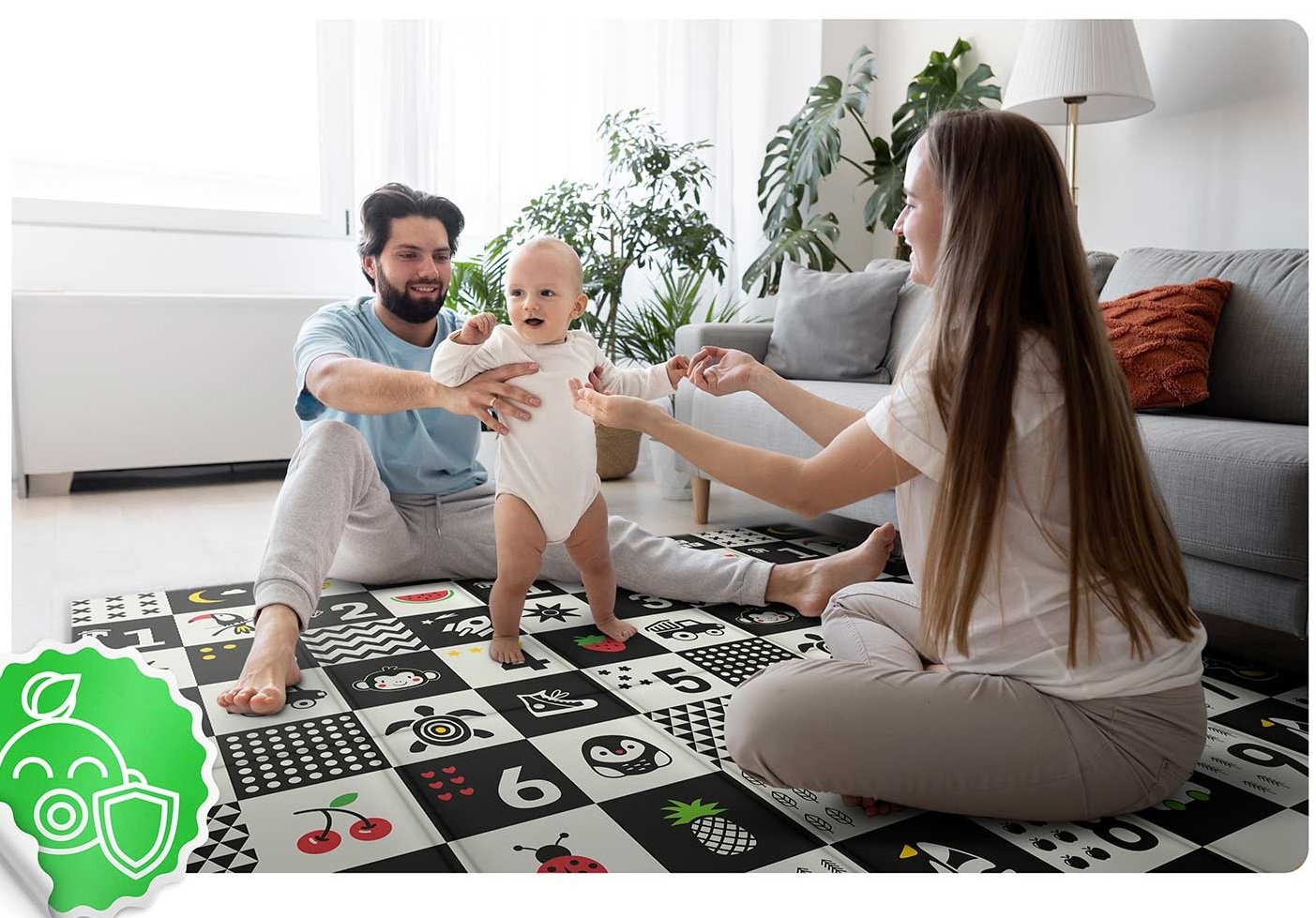 Το χαλάκι αυτό είναι ιδανικό την ασφάλεια των παιδιών, καθώς δεν περιέχει δισφαινόλη Α (BPA), PVC, φθαλικές ενώσεις ή φορμαμίδιο. Πληροί τα αυστηρά ευρωπαϊκά πρότυπα ασφαλείας, ενώ διαθέτει το Ευρωπαϊκό Πιστοποιητικό CE και έχει περάσει τις δοκιμές EN71-1, EN71-2 και EN71-3. Είναι επίσης τέλειο για παιδιά με ευαισθησίες ή αλλεργίες, καθώς δεν μαζεύει σκόνη ή ακάρεα.