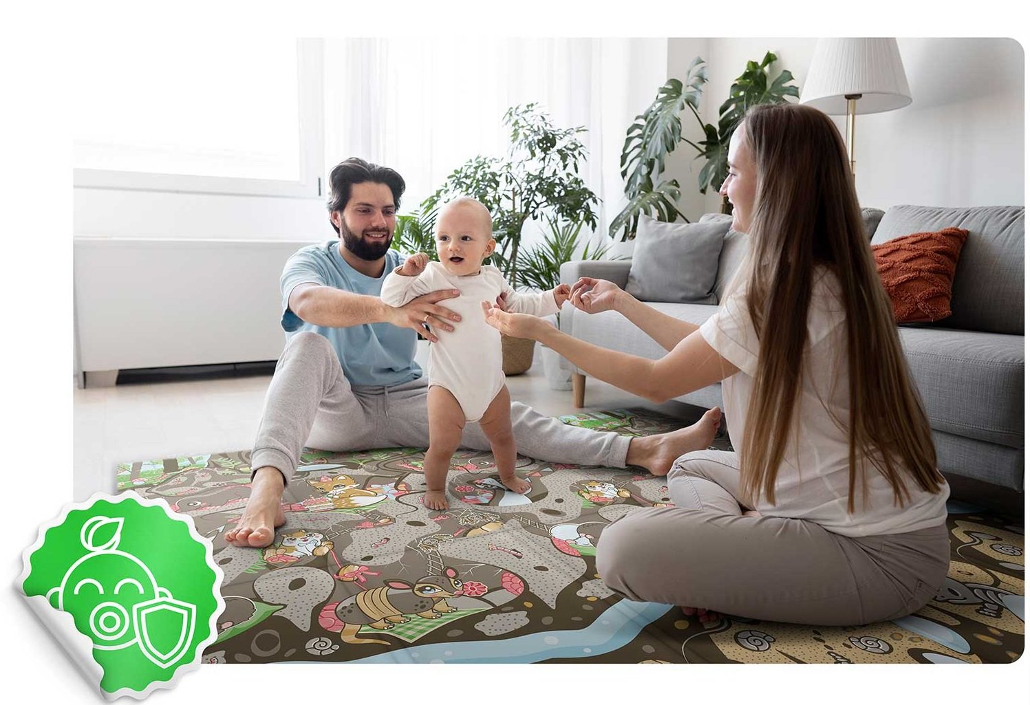 Το χαλάκι αυτό είναι ιδανικό την ασφάλεια των παιδιών, καθώς δεν περιέχει δισφαινόλη Α (BPA), PVC, φθαλικές ενώσεις ή φορμαμίδιο. Πληροί τα αυστηρά ευρωπαϊκά πρότυπα ασφαλείας, ενώ διαθέτει το Ευρωπαϊκό Πιστοποιητικό CE και έχει περάσει τις δοκιμές EN71-1, EN71-2 και EN71-3. Είναι επίσης τέλειο για παιδιά με ευαισθησίες ή αλλεργίες, καθώς δεν μαζεύει σκόνη ή ακάρεα.