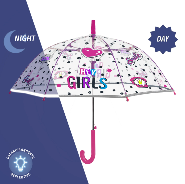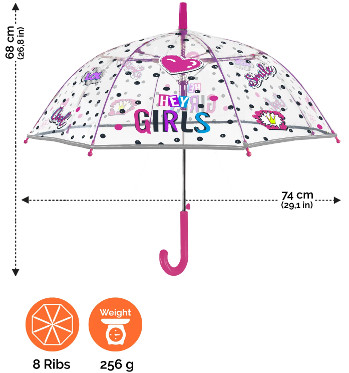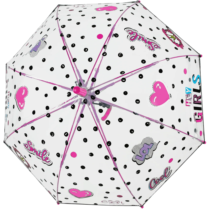 Διαθέτει αντιανεμικό σύστημα fiberglass που μπορεί να αντισταθεί ακόμη και στον πιο δυνατό άνεμο, ενώ το άνοιγμα είναι αυτόματο χάρη στο κουμπί που βρίσκεται πάνω από την λαβή και είναι εργονομικά σχεδιασμένο με 8 ακτίνες. Ο σχεδιασμός με τις φούξια καρδιές και τα γράμματα σε διάφανο φόντο, τα οποία ταιριάζουν υπέροχα με το χερούλι, θα κλέψει τις καρδιές των μικρών κοριτσιών!