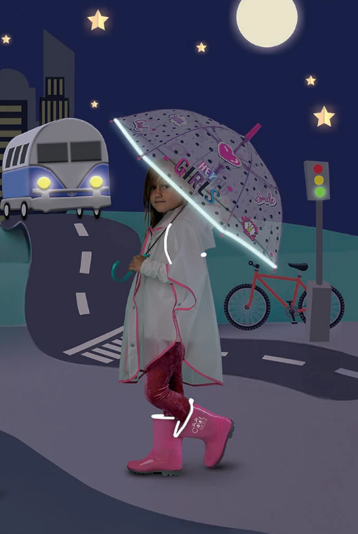 Επιπλέον, η ομπρέλα διαθέτει ανακλαστικά φωτός για την μεγαλύτερη ασφάλεια του παιδιού, τα οποία εγγυώνται κορυφαία ορατότητα επειδή είναι σε θέση να αντανακλούν το φως και να φωτίζουν όταν φωτίζουν πάνω τους οι προβολείς του αυτοκινήτου.