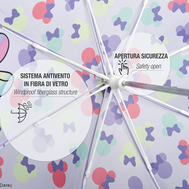 Είναι εργονομικά σχεδιασμένο με 8 ακτίνες και αποτελεί ένα χαρούμενο αξεσουάρ. Διαθέτει αντιανεμικό σύστημα fiberglass που μπορεί να αντισταθεί ακόμη και στον πιο δυνατό άνεμο, ενώ το άνοιγμα είναι χειροκίνητο και διευκολύνεται χάρη στο σύστημα ασφαλείας για τα δάχτυλα.