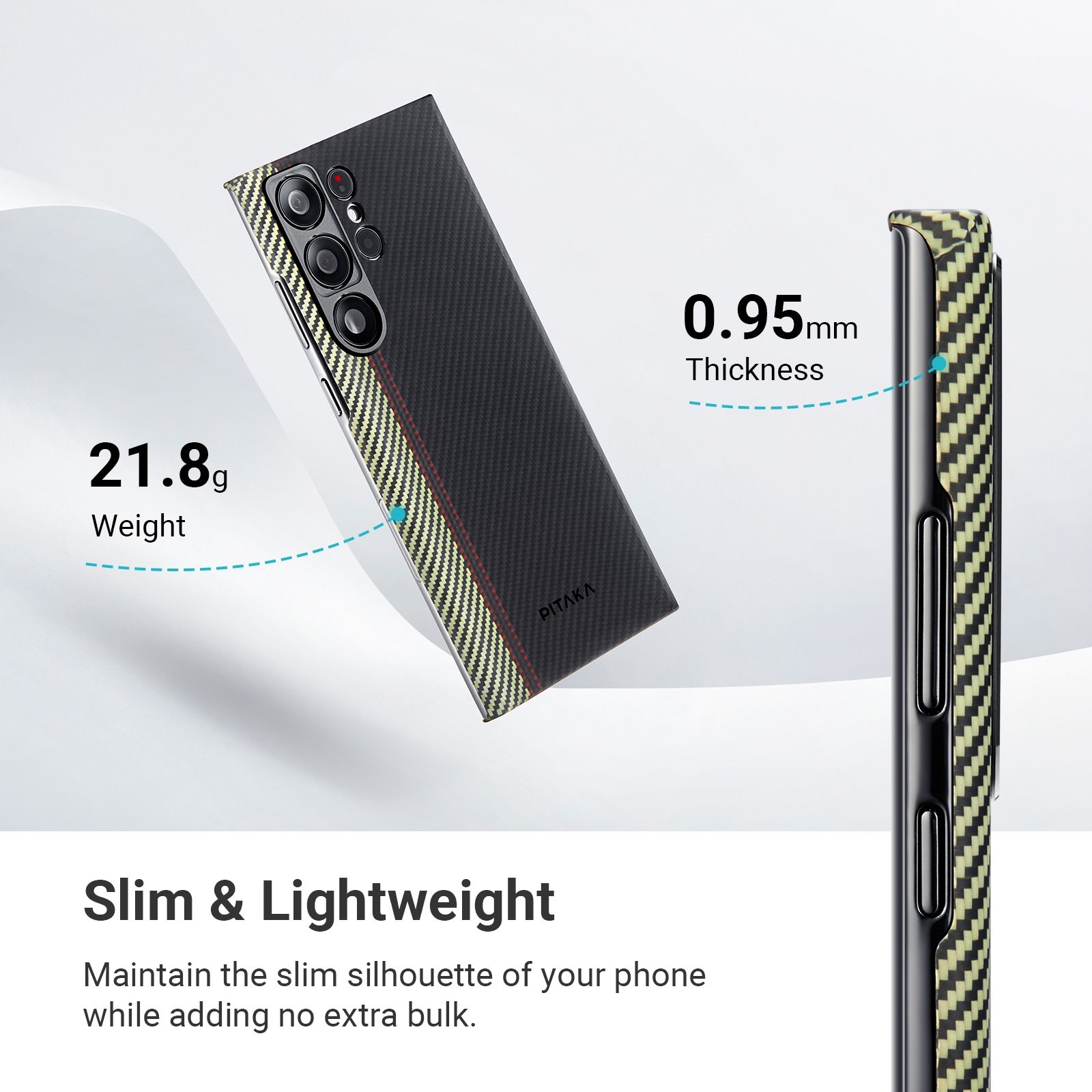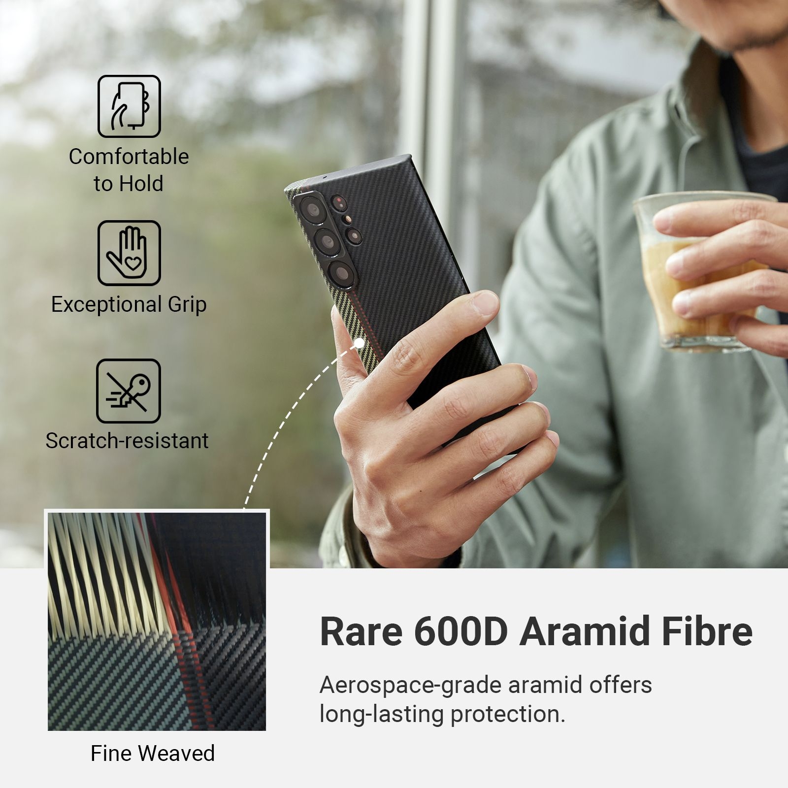 Η θήκη είναι κατασκευασμένη με χρήση ινών αραμιδίου αεροδιαστημικής ποιότητας, η οποία είναι 5 φορές ισχυρότερη από το ατσάλι αλλά είναι περίπου 5 φορές ελαφρύτερη. Προσφέρει μινιμαλιστικό στυλ, ώστε να απολαύσετε τον αυθεντικό σχεδιασμό του Samsung Galaxy S23 Ultra και να εκτιμήσετε την ομορφιά του όσο το δυνατόν περισσότερο. Η κοπή λοξοτομής κάνει τη θήκη να φαίνεται πιο λεπτή και πιο άνετη στο κράτημα.