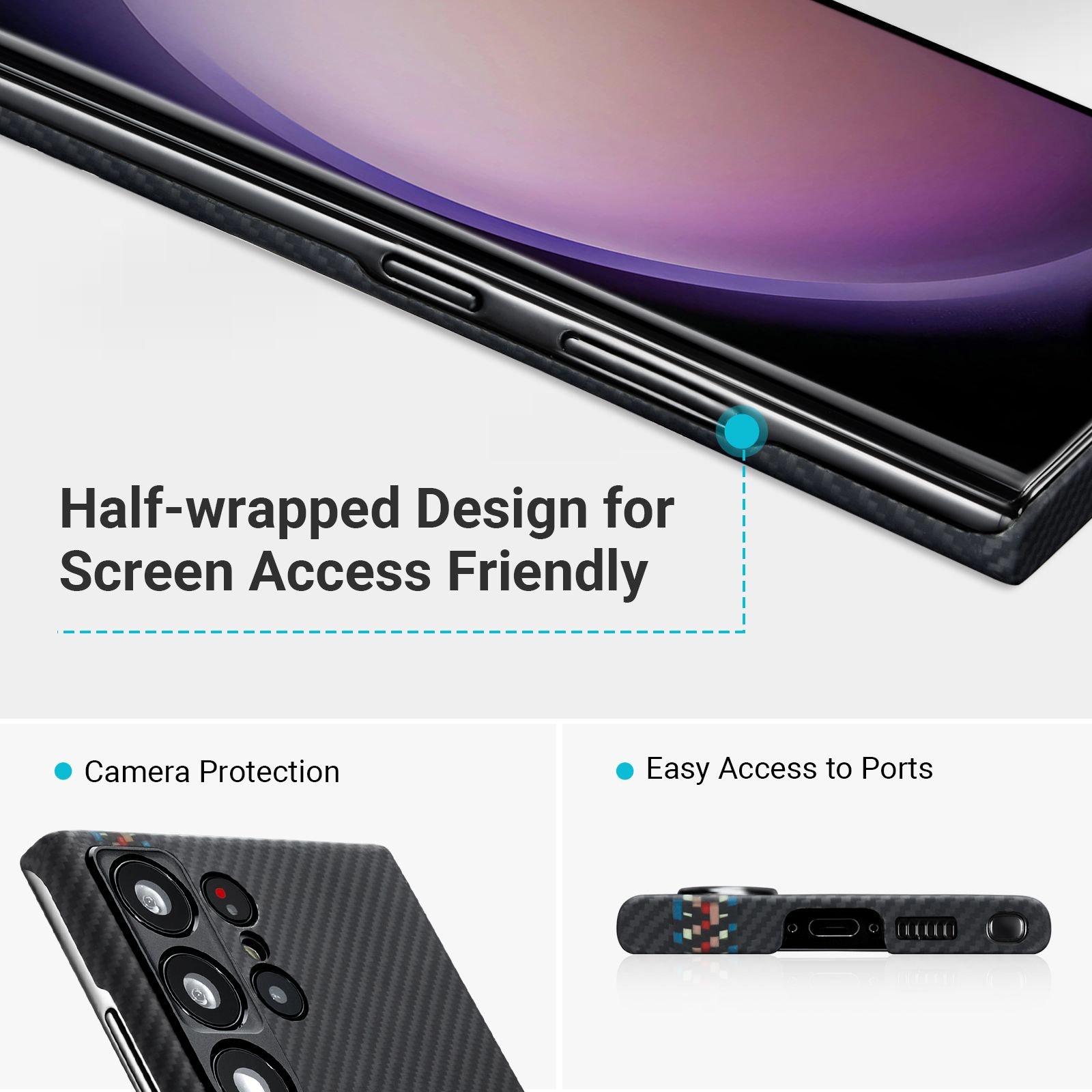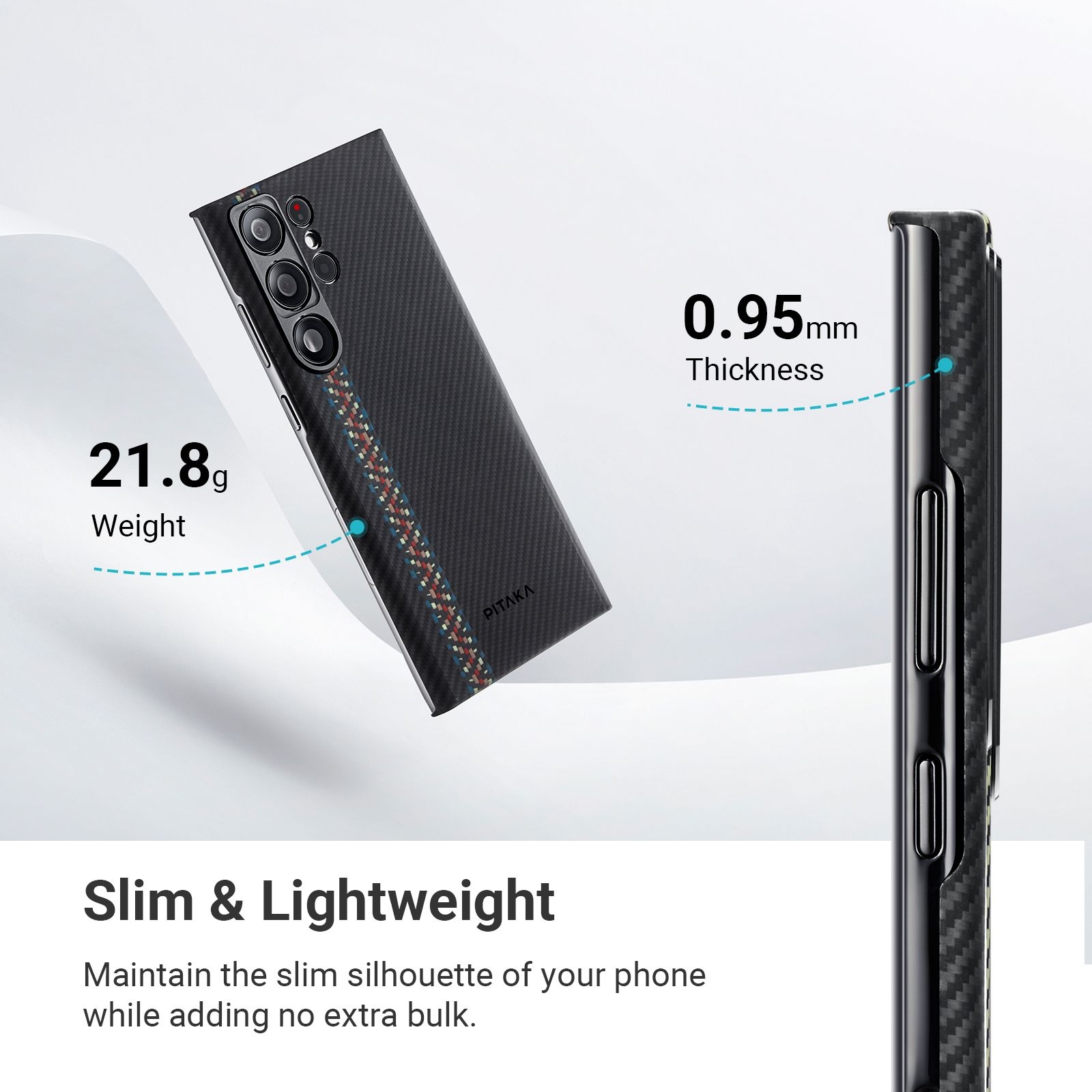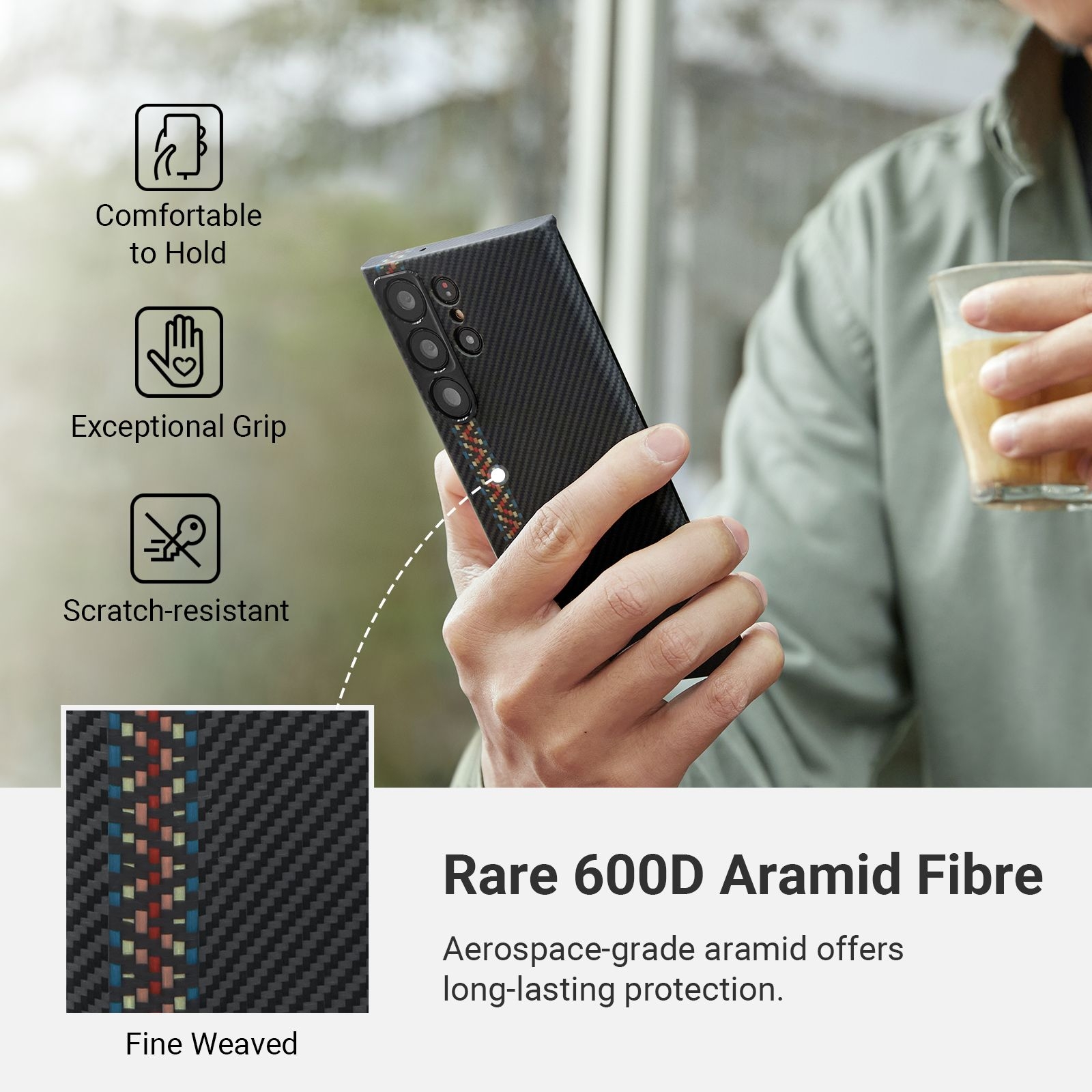 Η θήκη είναι κατασκευασμένη με χρήση ινών αραμιδίου αεροδιαστημικής ποιότητας, η οποία είναι 5 φορές ισχυρότερη από το ατσάλι αλλά είναι περίπου 5 φορές ελαφρύτερη. Προσφέρει μινιμαλιστικό στυλ, ώστε να απολαύσετε τον αυθεντικό σχεδιασμό του Samsung Galaxy S23 Ultra και να εκτιμήσετε την ομορφιά του όσο το δυνατόν περισσότερο. Η κοπή λοξοτομής κάνει τη θήκη να φαίνεται πιο λεπτή και πιο άνετη στο κράτημα.
