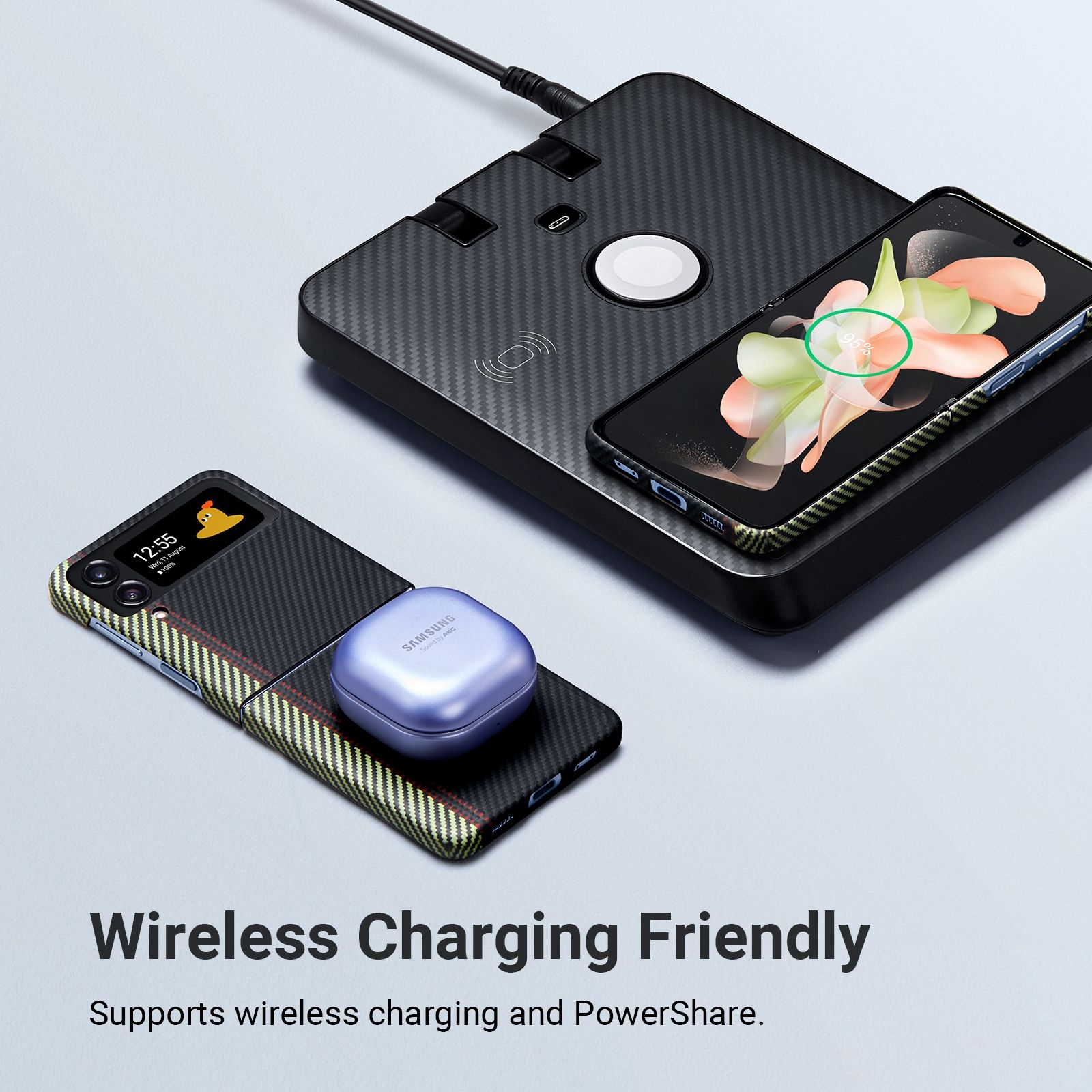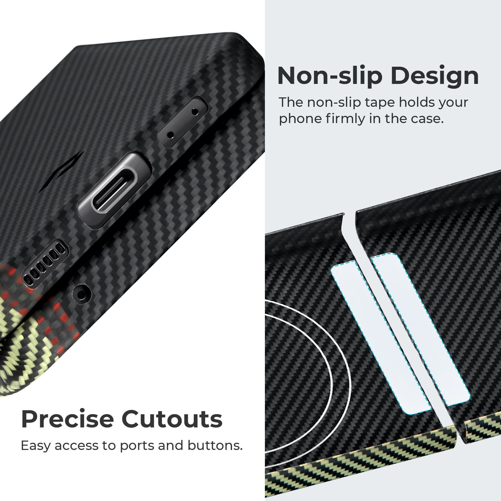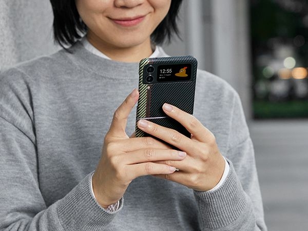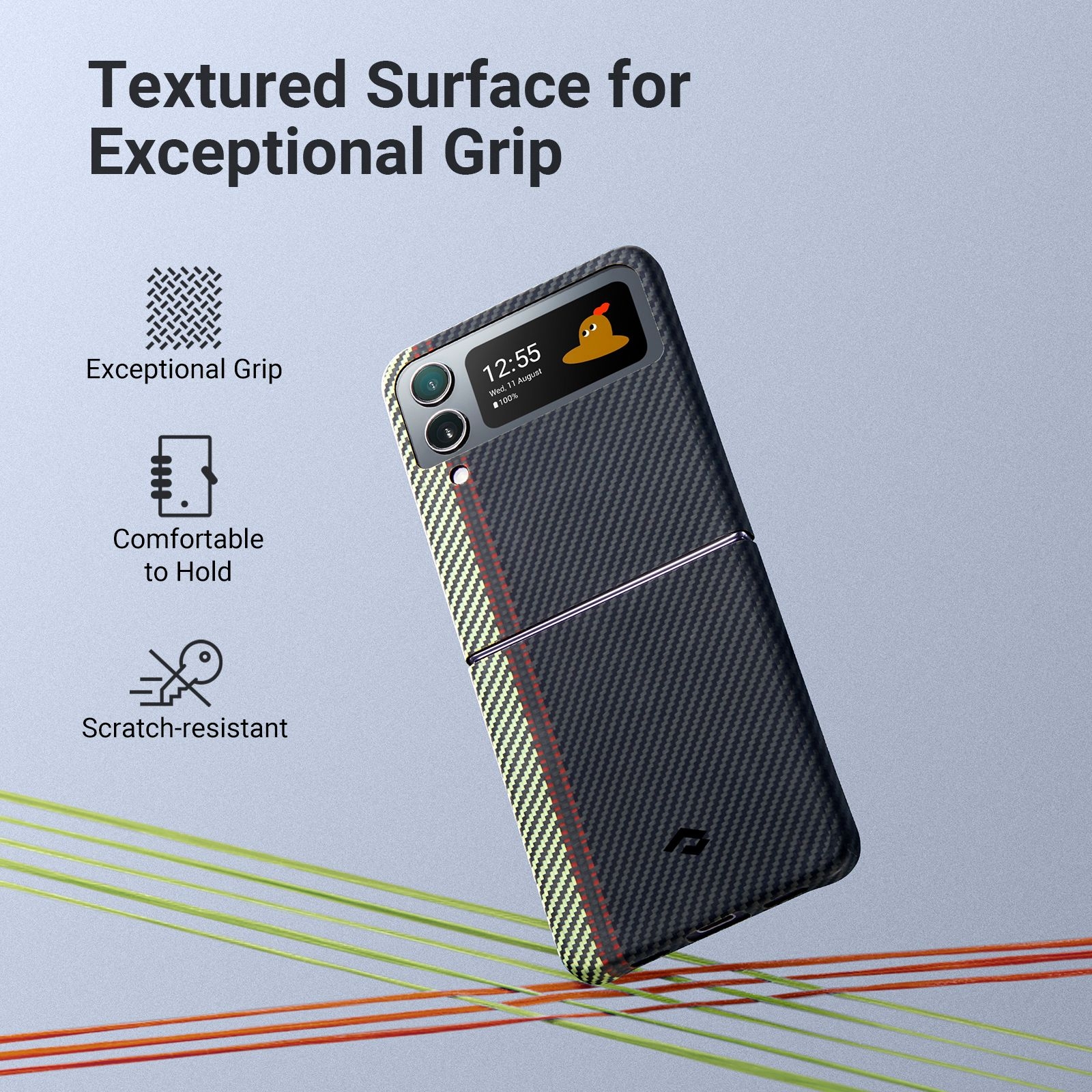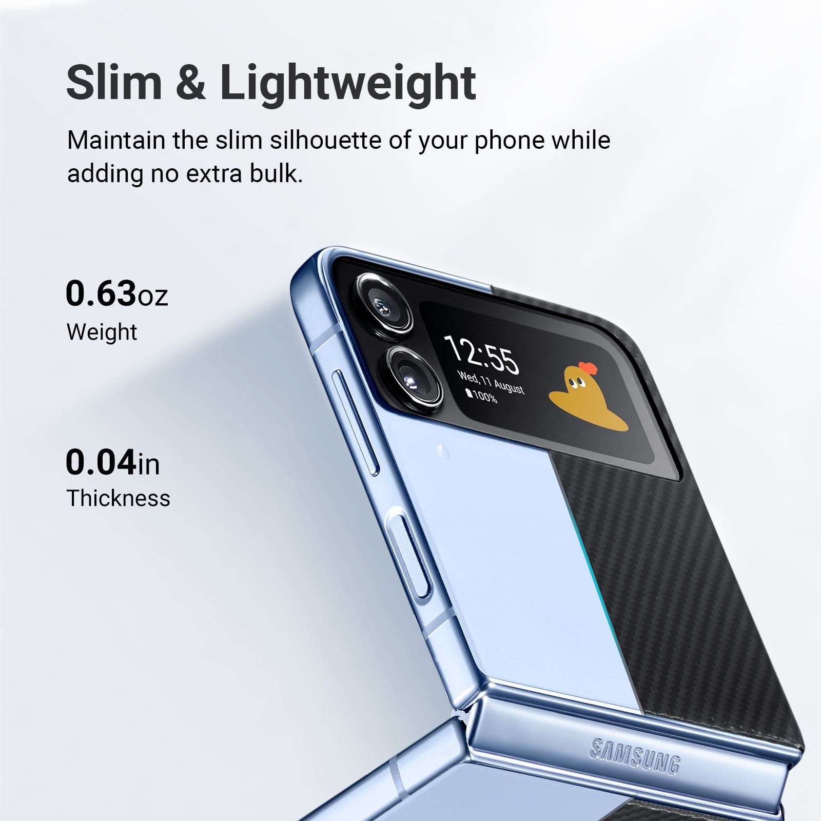Η θήκη είναι κατασκευασμένη με χρήση ινών αραμιδίου αεροδιαστημικής ποιότητας, η οποία είναι 5 φορές ισχυρότερη από το ατσάλι αλλά είναι περίπου 5 φορές ελαφρύτερη. Προσφέρει μινιμαλιστικό στυλ, ώστε να απολαύσετε τον αυθεντικό σχεδιασμό του Samsung Galaxy Z Flip4 και να εκτιμήσετε την ομορφιά του όσο το δυνατόν περισσότερο. Η κοπή λοξοτομής κάνει τη θήκη να φαίνεται πιο λεπτή και πιο άνετη στο κράτημα.