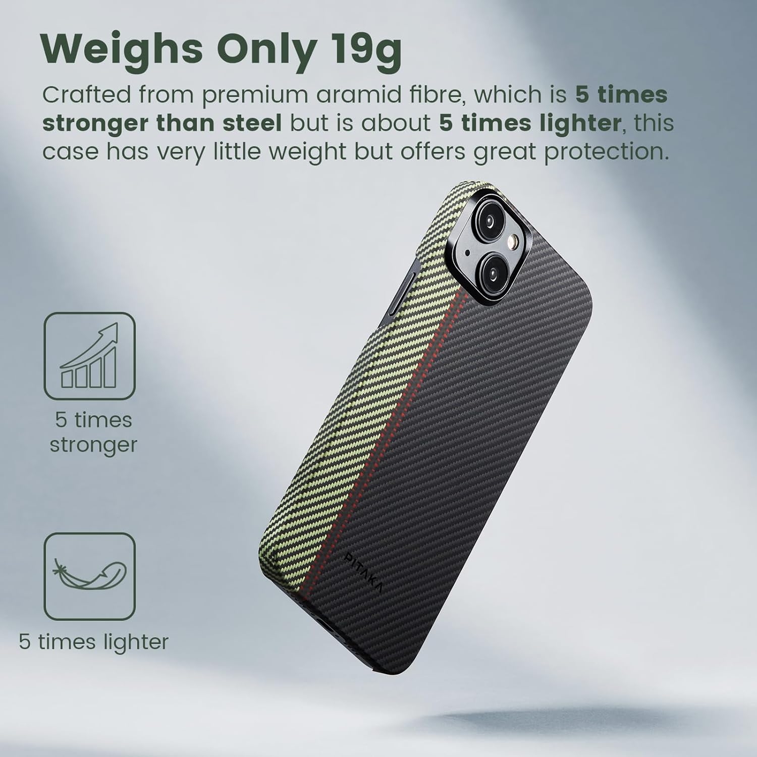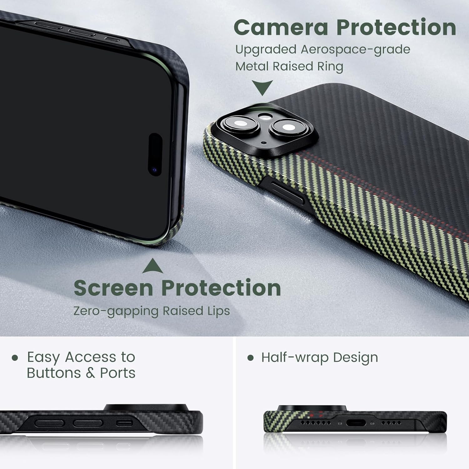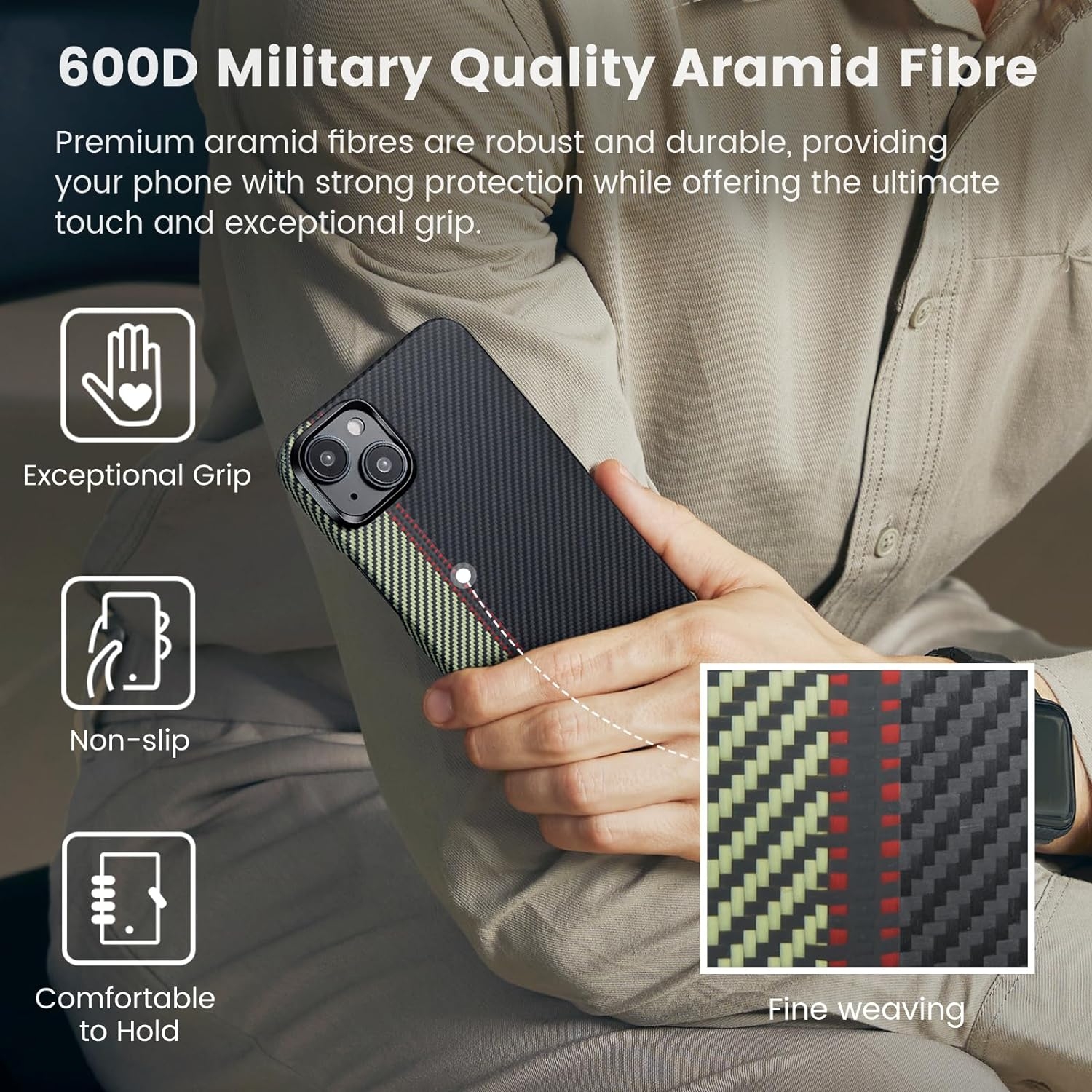 Η θήκη είναι κατασκευασμένη με χρήση ινών αραμιδίου αεροδιαστημικής ποιότητας, η οποία είναι 5 φορές ισχυρότερη από το ατσάλι αλλά είναι περίπου 5 φορές ελαφρύτερη. Προσφέρει μινιμαλιστικό στυλ, ώστε να απολαύσετε τον αυθεντικό σχεδιασμό του iPhone 15 και να εκτιμήσετε την ομορφιά του όσο το δυνατόν περισσότερο. Η κοπή λοξοτομής κάνει τη θήκη να φαίνεται πιο λεπτή και πιο άνετη στο κράτημα.