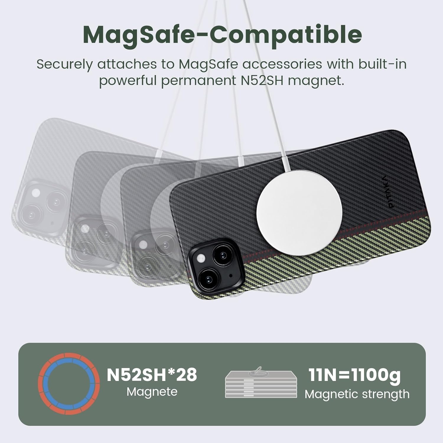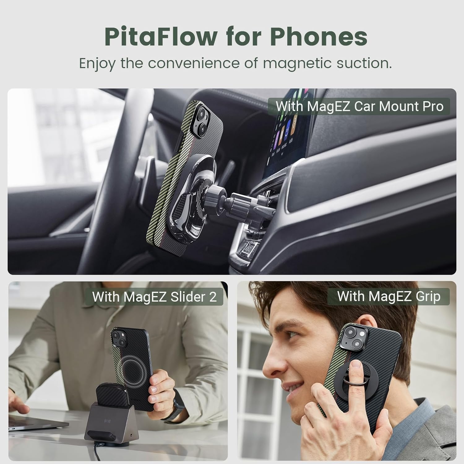 Προστατεύει το τηλέφωνό σας από γρατσουνιές, την καθημερινή χρήση αλλά και τα χτυπήματα. Επίσης διαθέτει ένα ανυψωμένο χείλος περιμετρικά της κάμερας, για επιπλέον προστασία. Εκτός από την συμβατότητά της με τον φορτιστή MagSafe, είναι συμβατή και με τα αξεσουάρ PitaFlow όπου προσαρμόζεται μαγνητικά όπως το 3-in-1 ασύρματο φορτιστή MagEZ Slider και στη λαβή MagEZ, ώστε να σας προσφέρει μια απρόσκοπτη εμπειρία είτε βρίσκεστε στο αυτοκίνητο, στο γραφείο ή εν κινήσει.