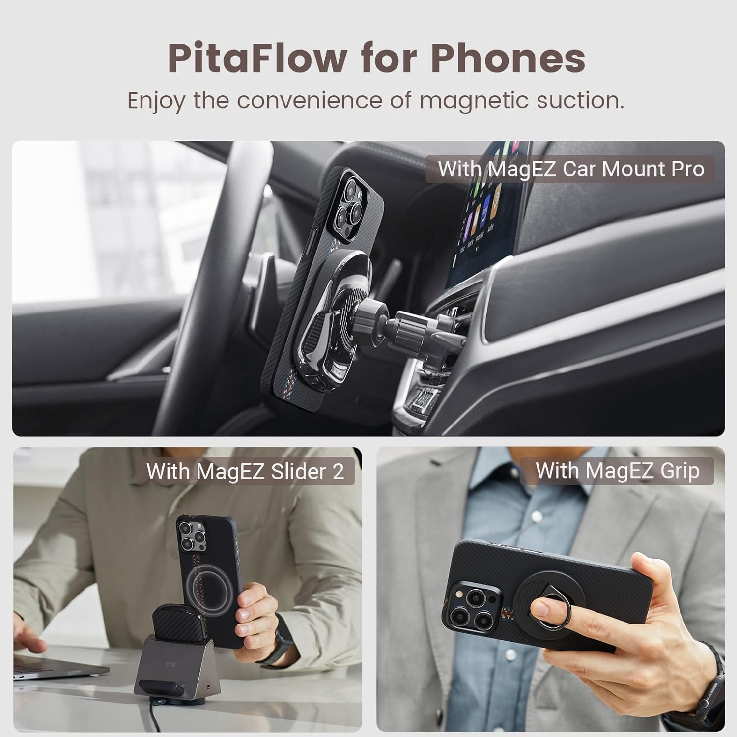 Προστατεύει το τηλέφωνό σας από γρατσουνιές, την καθημερινή χρήση αλλά και τα χτυπήματα. Επίσης διαθέτει ένα ανυψωμένο χείλος περιμετρικά της κάμερας, για επιπλέον προστασία. Εκτός από την συμβατότητά της με τον φορτιστή MagSafe, είναι συμβατή και με τα αξεσουάρ PitaFlow όπου προσαρμόζεται μαγνητικά όπως το 3-in-1 ασύρματο φορτιστή MagEZ Slider και στη λαβή MagEZ, ώστε να σας προσφέρει μια απρόσκοπτη εμπειρία είτε βρίσκεστε στο αυτοκίνητο, στο γραφείο ή εν κινήσει.