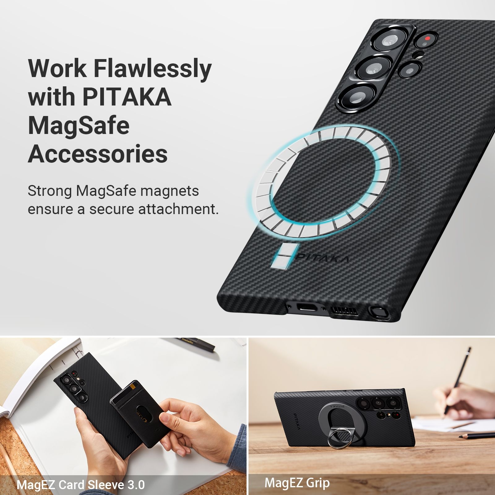 Η θήκη MagEZ Case 3 της Pitaka είναι η πιο λεπτή και ελαφριά θήκη που έχει σχεδιαστεί για το αγαπημένο σας Samsung Galaxy S23 Ultra και αποπνέει διαχρονική πολυτέλεια. Είναι κατασκευασμένη από ανθεκτικές ίνες αραμιδίου και είναι συμβατή με αξεσουάρ MagSafe, ενώ είναι τόσο λεπτή όσο μια πιστωτική κάρτα!