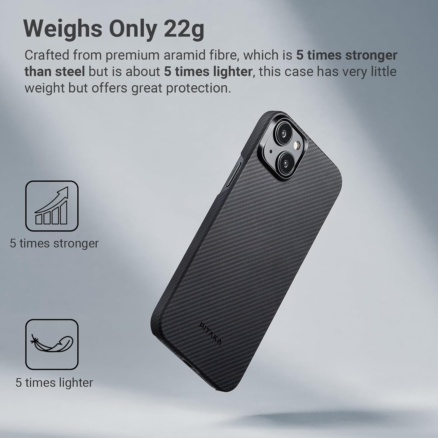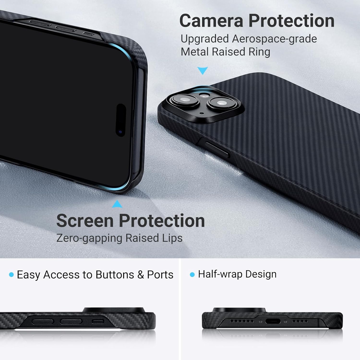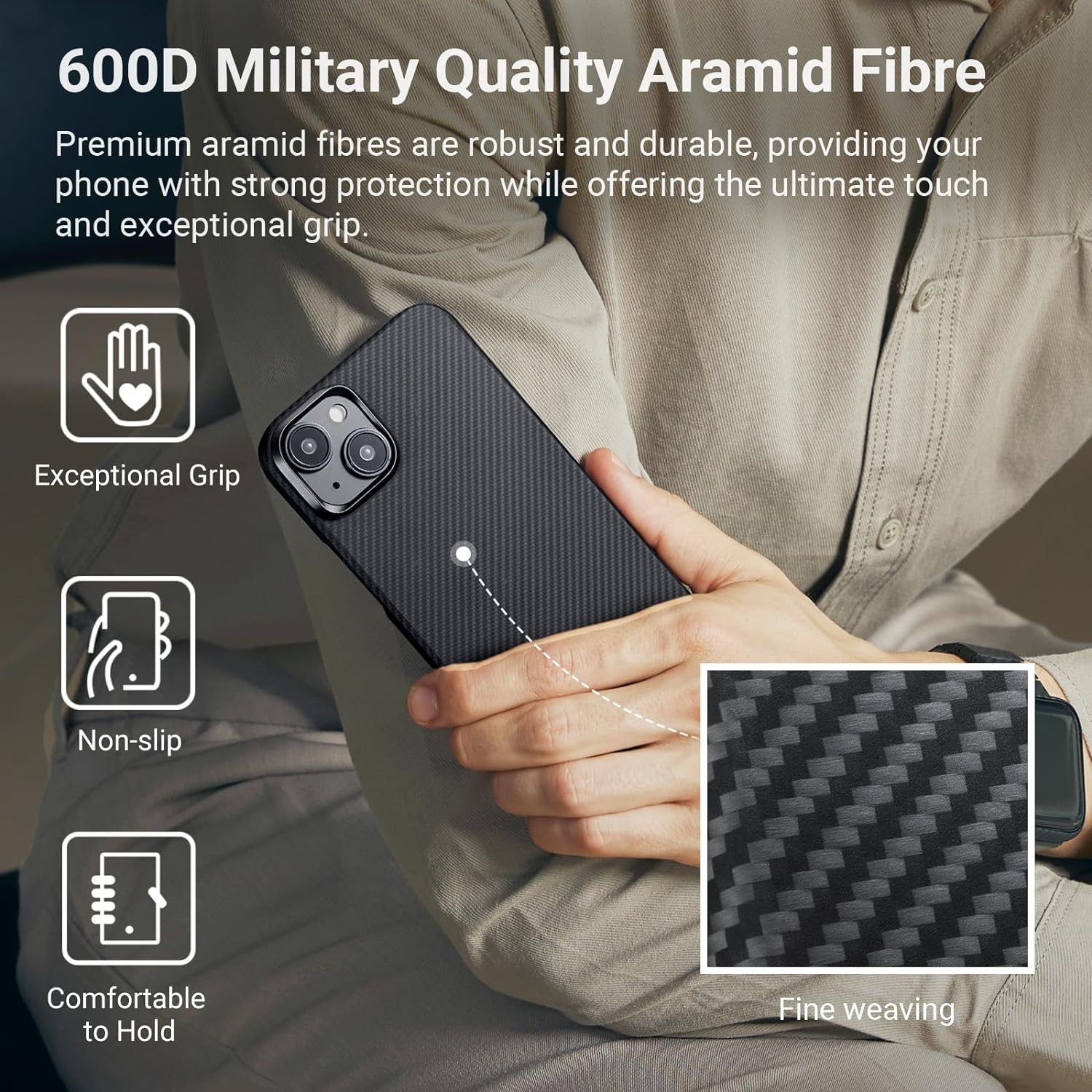 Η θήκη είναι κατασκευασμένη με χρήση ινών αραμιδίου αεροδιαστημικής ποιότητας, η οποία είναι 5 φορές ισχυρότερη από το ατσάλι αλλά είναι περίπου 5 φορές ελαφρύτερη. Προσφέρει μινιμαλιστικό στυλ, ώστε να απολαύσετε τον αυθεντικό σχεδιασμό του iPhone 15 Plus και να εκτιμήσετε την ομορφιά του όσο το δυνατόν περισσότερο. Η κοπή λοξοτομής κάνει τη θήκη να φαίνεται πιο λεπτή και πιο άνετη στο κράτημα.