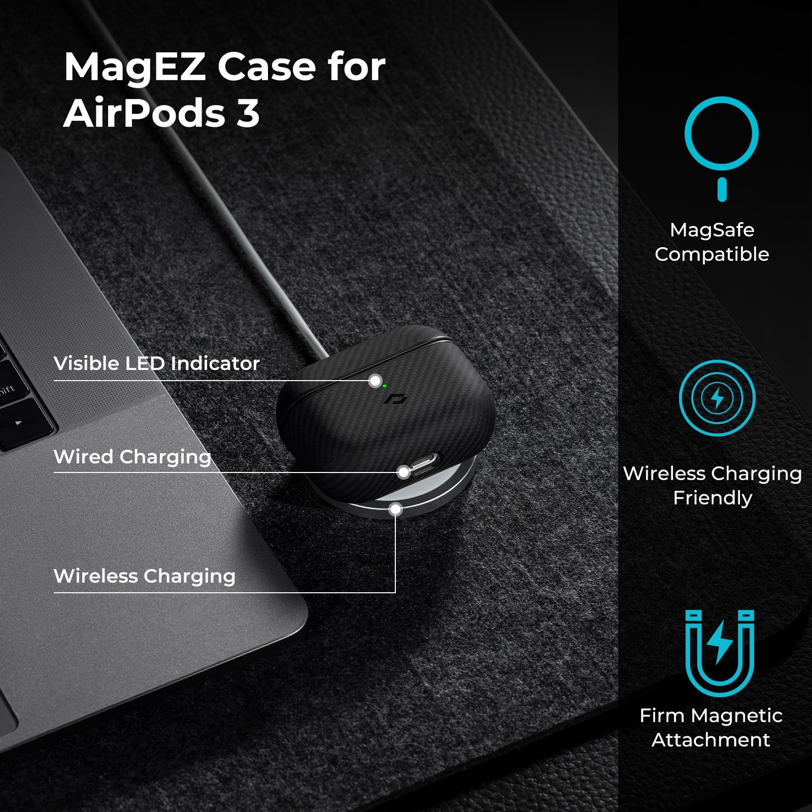 Σας επιτρέπει εύκολη πρόσβαση σε όλες τις λειτουργίες, όπως στην ένδειξη φόρτισης LED και στη θύρα Lightning χωρίς να αφαιρείτε τη θήκη. Αυτή η μινιμαλιστική θήκη ταιριάζει άνετα στα AirPods 3rd Gen σας, διατηρώντας το μέγεθος και το σχήμα τσέπης. Μπορεί να φορτιστεί ασύρματα, με φορτιστή MagSafe ή με καλώδιο Lightning. Φορτίστε χρησιμοποιώντας το φορτιστή της Pitaka, το MagEZ Slider για ένα δυναμικό συνδυασμό!