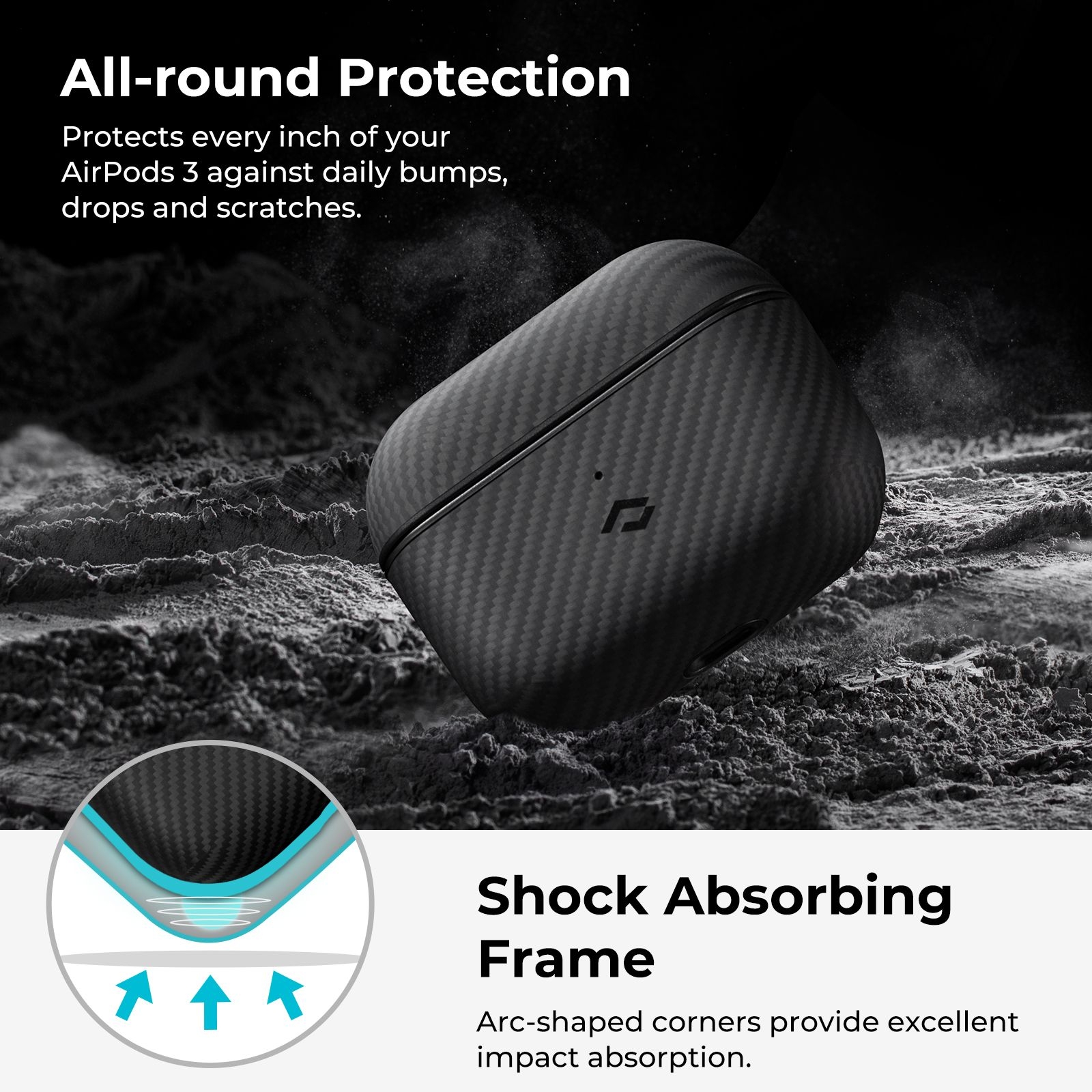 Είναι μία εξαιρετικά λεπτή και ελαφριά θήκη, η οποία προσφέρει ολόπλευρη προστασία στη συσκευή σας, προστατεύοντας κάθε ίντσα των AirPods 3rd Gen σας από καθημερινά χτυπήματα, πτώσεις και γρατσουνιές, απορροφώντας τους κραδασμούς χάρη στις γωνίες σε σχήμα τόξου, οι οποίες παρέχουν εξαιρετική απορρόφηση κραδασμών.