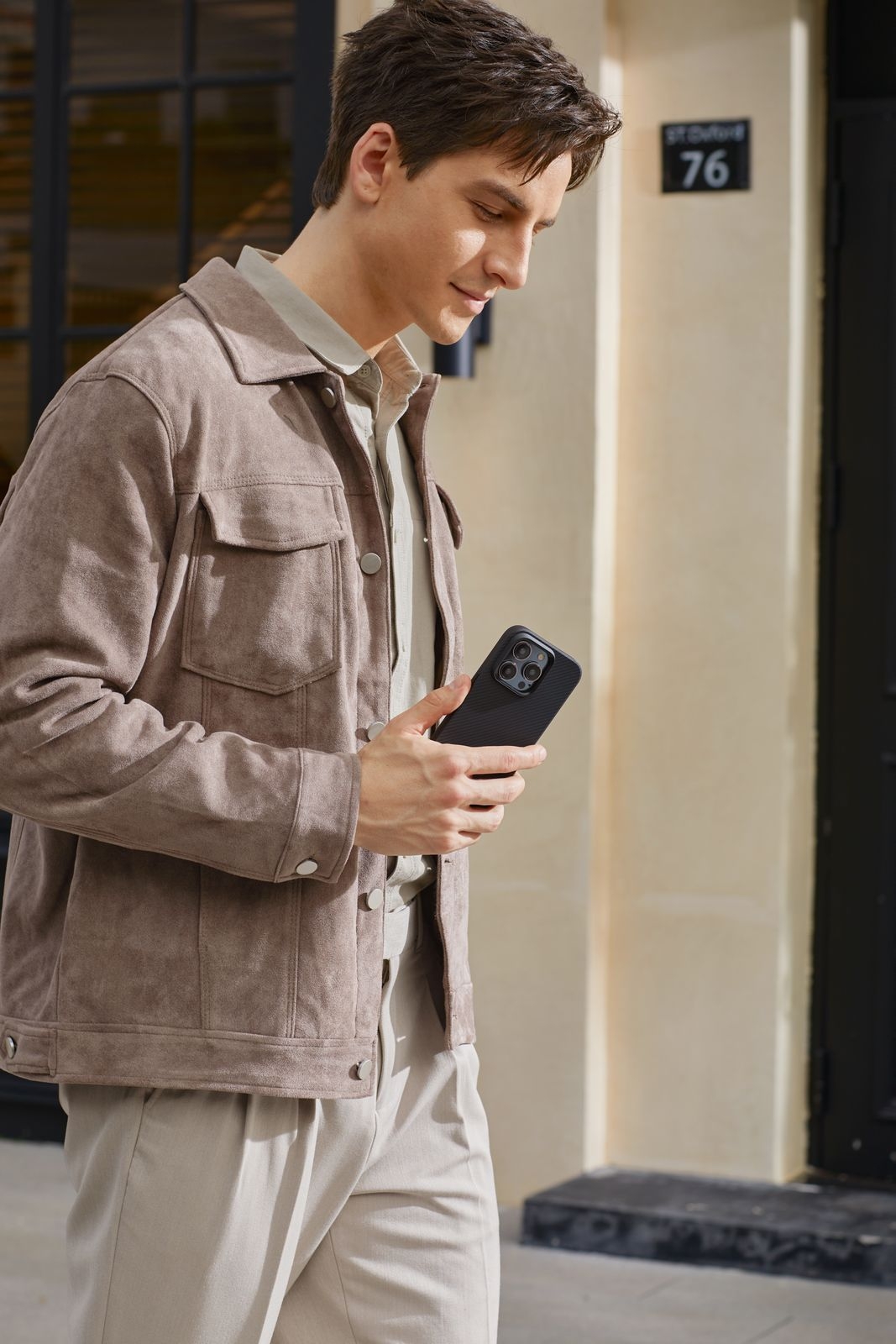 Και χάρη στην τεχνολογία 3D Injection Molding Labeling, τα πλαϊνά της θήκης καλύπτονται επίσης από ίνες αραμιδίου για να σας προσφέρουν μια απαλή, άνετη αίσθηση όπως κι αν κρατάτε το τηλέφωνο. Επιπλέον, προσαρμόζεται μαγνητικά στον ασύρματο φορτιστή MagEZ Slider 3 σε 1, στη βάση αυτοκινήτου MagSafe, στη θήκη κάρτας και στη λαβή MagEZ για να απολαμβάνετε ασφαλή σύνδεση και σταθερή ασύρματη φόρτιση, αξιοποιώντας στο έπακρο το iPhone 15 Pro σας.