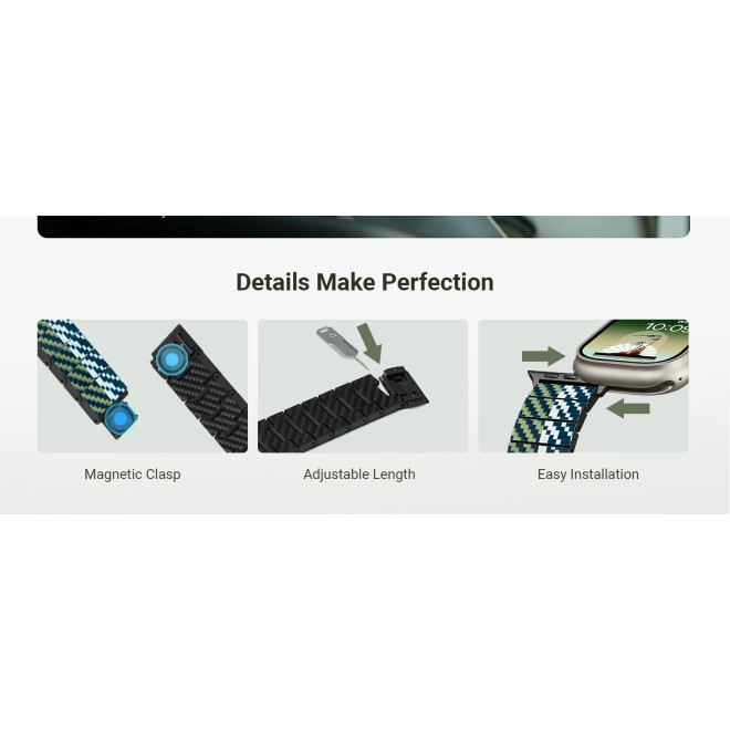 Είναι εξαιρετικά ελαφρύ με βάρος μόλις 31gr και σε συνδυασμό με τον λεπτό σχεδιασμό υψηλής τεχνολογίας, δεν είναι μόνο μοναδικό σχεδιαστικά αλλά και εξαιρετικά ανθεκτικό. Η μινιμαλιστική, αλλά ξεχωριστή αισθητική και το κομψό, λείο ύφος του, είναι μια μοντέρνα προσθήκη σε κάθε Apple Watch και για τη μεγαλύτερη άνεση και ασφάλεια στο Smartwatch σας. Η Pitaka έχει διασφαλίσει να κατασκευάσει ένα μοναδικό μαγνητικό κούμπωμα από ανοξείδωτο ατσάλι και από δυνατούς μαγνήτες νεοδυμίου.