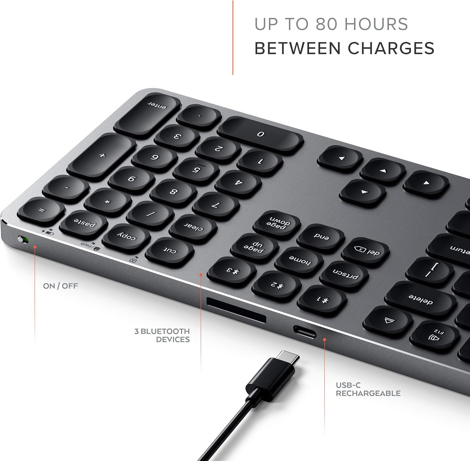 Το πλήρες αριθμητικό πληκτρολόγιο είναι ιδανικό για την εισαγωγή δεδομένων, οικονομικές εφαρμογές ή λογιστικές εργασίες. Η ενσωματωμένη επαναφορτιζόμενη μπαταρία με θύρα Type-C εξασφαλίζει έως και 80 ώρες συνεχούς χρήσης και έως 100 ημέρες αναμονής. Ακόμα και κατά τη φόρτιση, το πληκτρολόγιο λειτουργεί κανονικά χωρίς διακοπές!