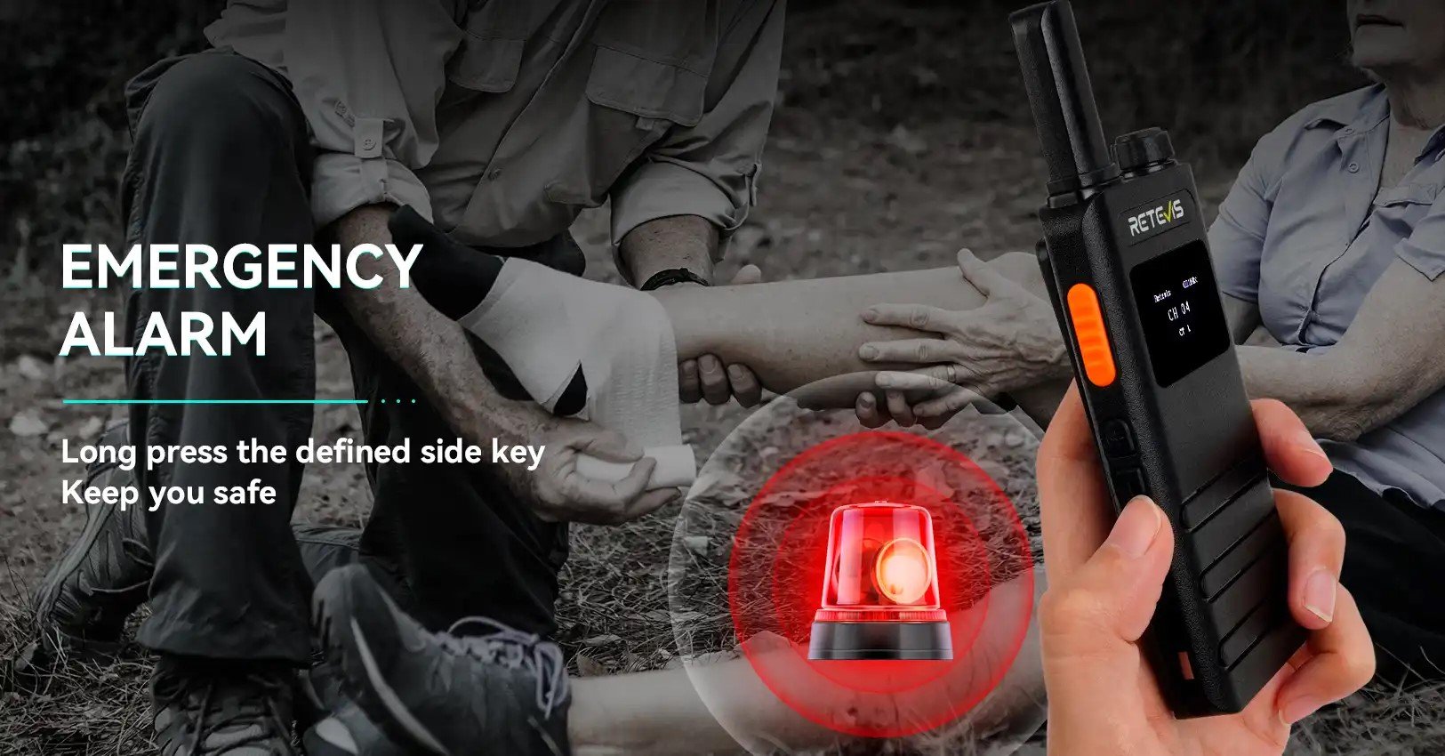 Σε περίπτωση έκτακτης ανάγκης, πατήστε και κρατήστε πατημένο το καθορισμένο κάτω κουμπί για να ενεργοποιήσετε άμεσα τον τοπικό και απομακρυσμένο συναγερμό, ώστε να λάβετε γρήγορα την απαραίτητη βοήθεια. Επίσης, διαθέτει ρυθμιζόμενα επίπεδα squelch από 0 έως 9, τα οποία εξαλείφουν ή καταστέλλουν τον περιβαλλοντικό θόρυβο όταν δεν λαμβάνεται σήμα, με αυτόν τον τρόπο αποφεύγεται η απώλεια σημάτων.