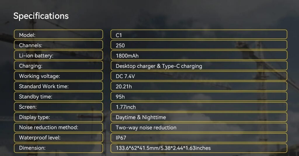 Ο επαγγελματικός πομποδέκτης C1 της Retevis, διαθέτει επαναφορτιζόμενη μπαταρία 1800mAh, εξασφαλίζοντας έως και 20 ώρες συνεχούς λειτουργίας σε απαιτητικές συνθήκες εξωτερικού χώρου. Είναι πιστοποιημένος με IP67 για πλήρη αδιαβροχοποίηση, αντέχει σε βύθιση έως 1 μέτρο για 30 λεπτά και είναι ιδανικός για χρήση σε εξωτερικούς χώρους.