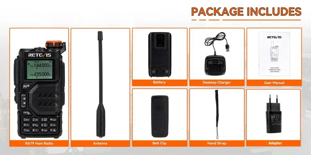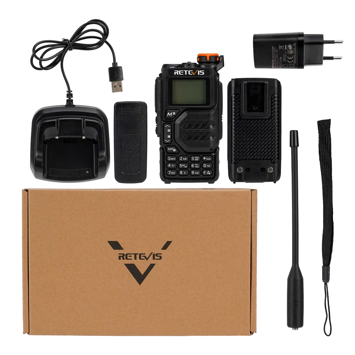 Η συσκευασία περιλαμβάνει: 1 x Πομποδέκτης, 1 x Kεραία, 1 x Κλιπ Ζώνης 1 x Επιτραπέζια βάση φόρτισης με Καλώδιο USB-A, 1 x Αποσπώμενη επαναφορτιζόμενη μπαταρία, 1 x Λουράκι καρπού, 1 x Αντάπτορας, Οδηγίες χρήσης στα Ελληνικά και στα Αγγλικά.