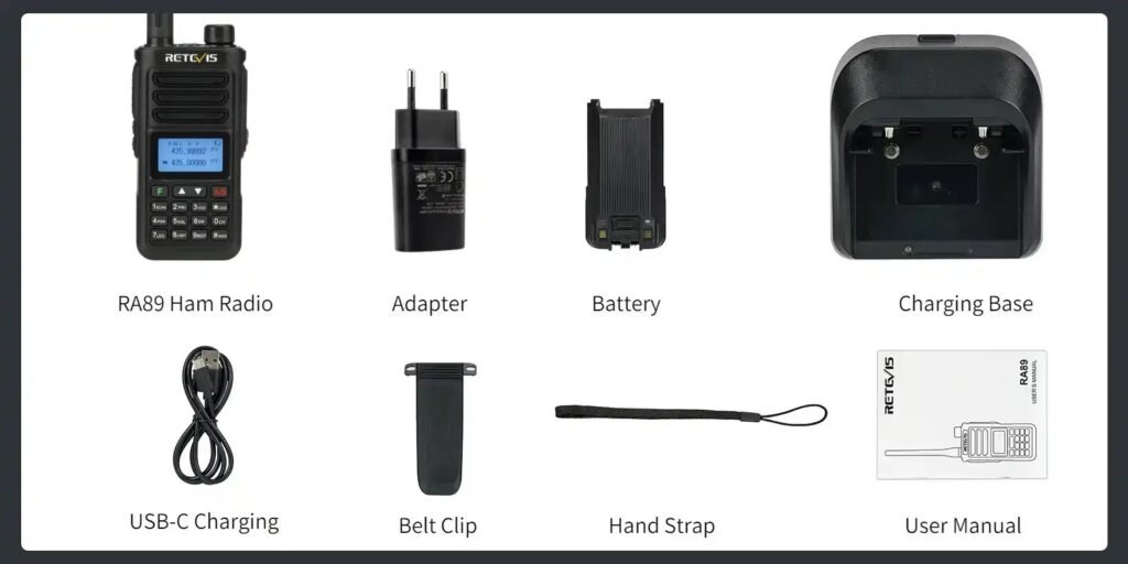 Η συσκευασία περιλαμβάνει: 1 x Πομποδέκτης με κεραία, 1 x Κλιπ Ζώνης, 1 x Επιτραπέζια βάση φόρτισης, 1 x Αποσπώμενη επαναφορτιζόμενη μπαταρία, 1 x Καλώδιο φόρτισης USB-A σε Type-C, 1 x Λουράκι καρπού, 1 x Αντάπτορας, Οδηγίες χρήσης στα Ελληνικά και στα Αγγλικά.
