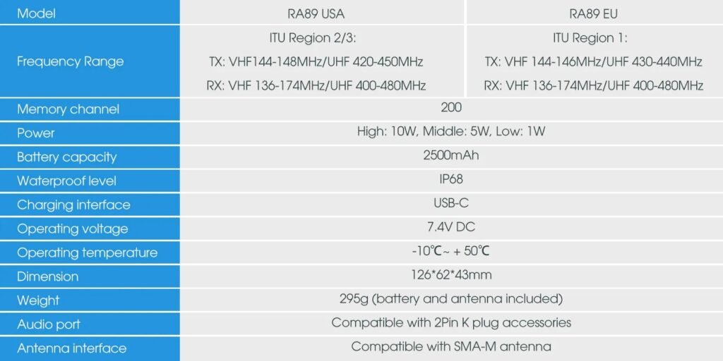 Σε έναν επιχειρηματικό κόσμο όπου οι επικοινωνίες πρέπει να είναι αποτελεσματικές, αξιόπιστες και βολικές, ο RA89 ξεχωρίζει με την υψηλή ισχύ 10W για μεγάλη εμβέλεια, την μπαταρία λιθίου 2,500 mAh, την πιστοποίηση IP68 με αδιάβροχη και ανθεκτική στη σκόνη κατασκευή, την έξυπνη τεχνολογία μείωσης θορύβου και τον ανθεκτικό σχεδιασμό.