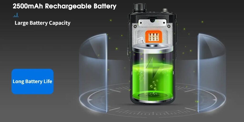 Διαθέτει ισχυρή μπαταρία ιόντων λιθίου 2.500mAh, προσφέροντας μεγάλη διάρκεια λειτουργίας για χρήση καθ’ όλη τη διάρκεια της ημέρας, έτσι είναι ιδανικός για εξωτερικές δραστηριότητες και μειώνει την ανάγκη για συχνή φόρτιση. Υποστηρίζει λειτουργία διπλής ζώνης (2m/70cm), έτσι ώστε να μπορεί να ανταποκριθεί σε διαφορετικά περιβάλλοντα χρήσης. Η ζώνη UHF είναι ιδανική όταν βρίσκεστε στην πόλη, ενώ η ζώνη VHF είναι ιδανική όταν βρίσκεστε στην πόλη.