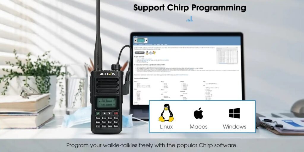 Για να ενεργοποιήσετε τον συναγερμό έκτακτης ανάγκης, πατήστε το πλήκτρο «F» και το πλήκτρο «# Radio», με τη σειρά. Η λειτουργία αυτή σας επιτρέπει να καλέσετε σε βοήθεια άτομα που βρίσκονται κοντά σας σε περίπτωση έκτακτης ανάγκης. Επίσης, διαθέτει υποστήριξη προγραμματισμού με το Chirp, το Chirp είναι ένα λογισμικό ανοιχτού κώδικα, συμβατό με macOS, Windows και Linux, που διευκολύνει τον προγραμματισμό των πομποδεκτών σας.