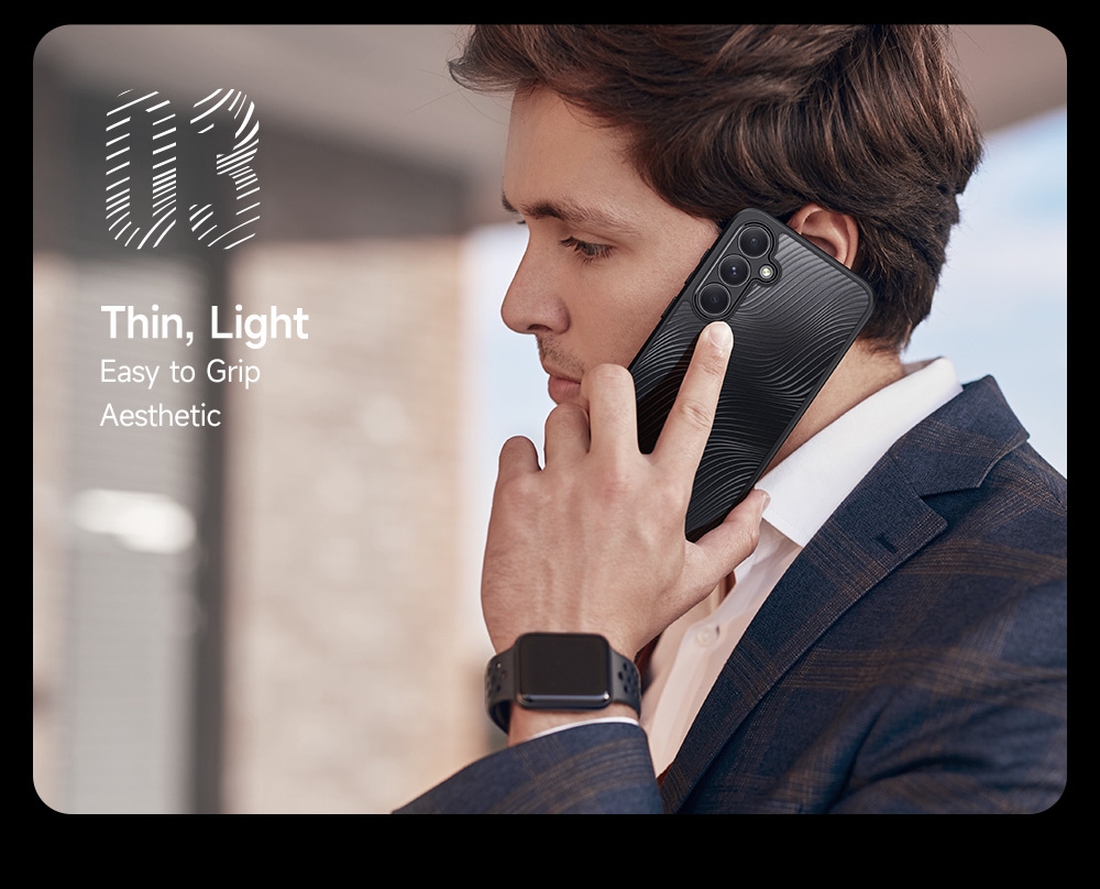 Αγκαλιάζει περιμετρικά τη συσκευή ώστε να προστατεύει το Samsung Galaxy A35 και διαθέτει ένα υπερυψωμένο χείλος περιμετρικά της οθόνης και της κάμερας, ώστε να προστατεύει την συσκευή σας από τις επίπεδες επιφάνειες. Ταυτόχρονα, η υφή της θήκης στη πλάτη είναι πολύ ευχάριστη και απαλή.