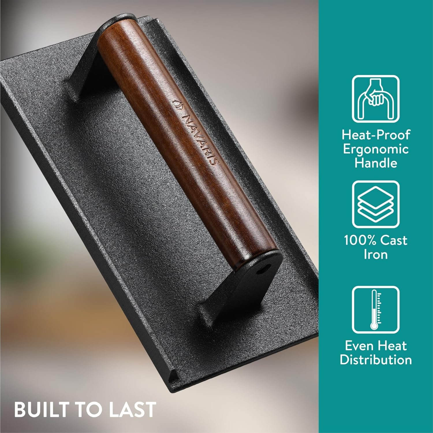 Σχεδιασμένη με μία άνετη και ανθεκτική ξύλινη λαβή, για σταθερό κράτημα το οποίο προστατεύει τα χέρια σας από τη θερμότητα, καθιστώντας τη διαδικασία του ψησίματος εύκολη και ασφαλή. Το κάτω μέρος της πρέσας έχει ειδικές αυλακώσεις, ώστε τα μπιφτέκια σας να έχουν τα χαρακτηριστικά σημάδια του ψησίματος, προσφέροντας μία γκουρμέ εμφάνιση αλλά και τραγανή υφή.