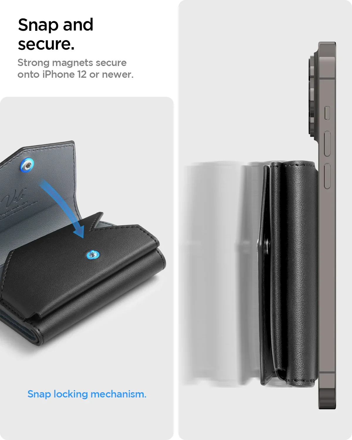 Κατασκευασμένο από υψηλής ποιότητας premium vegan δέρμα velo, με υπέροχη αίσθηση και κράτημα, ενώ τοποθετείται πολύ εύκολα στο πίσω μέρος του κινητού σας, χάρη στο ισχυρό ενσωματωμένο μαγνήτη. Επιπλέον, διαθέτει τριπλή διάταξη, σαν ένα κομψό κλασικό πορτοφόλι με κούμπωμα.