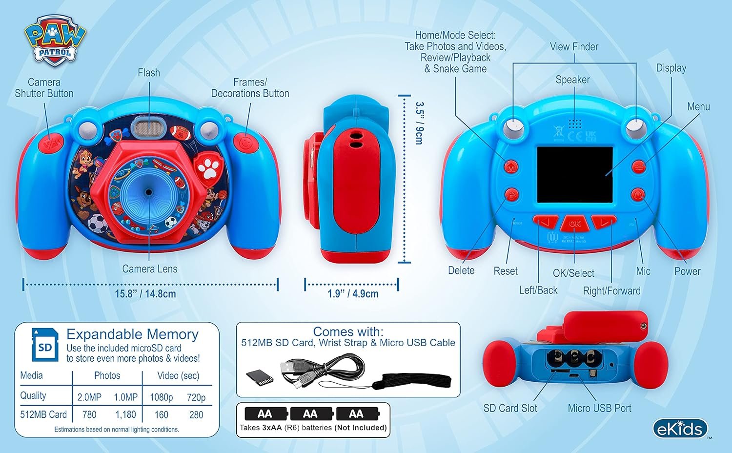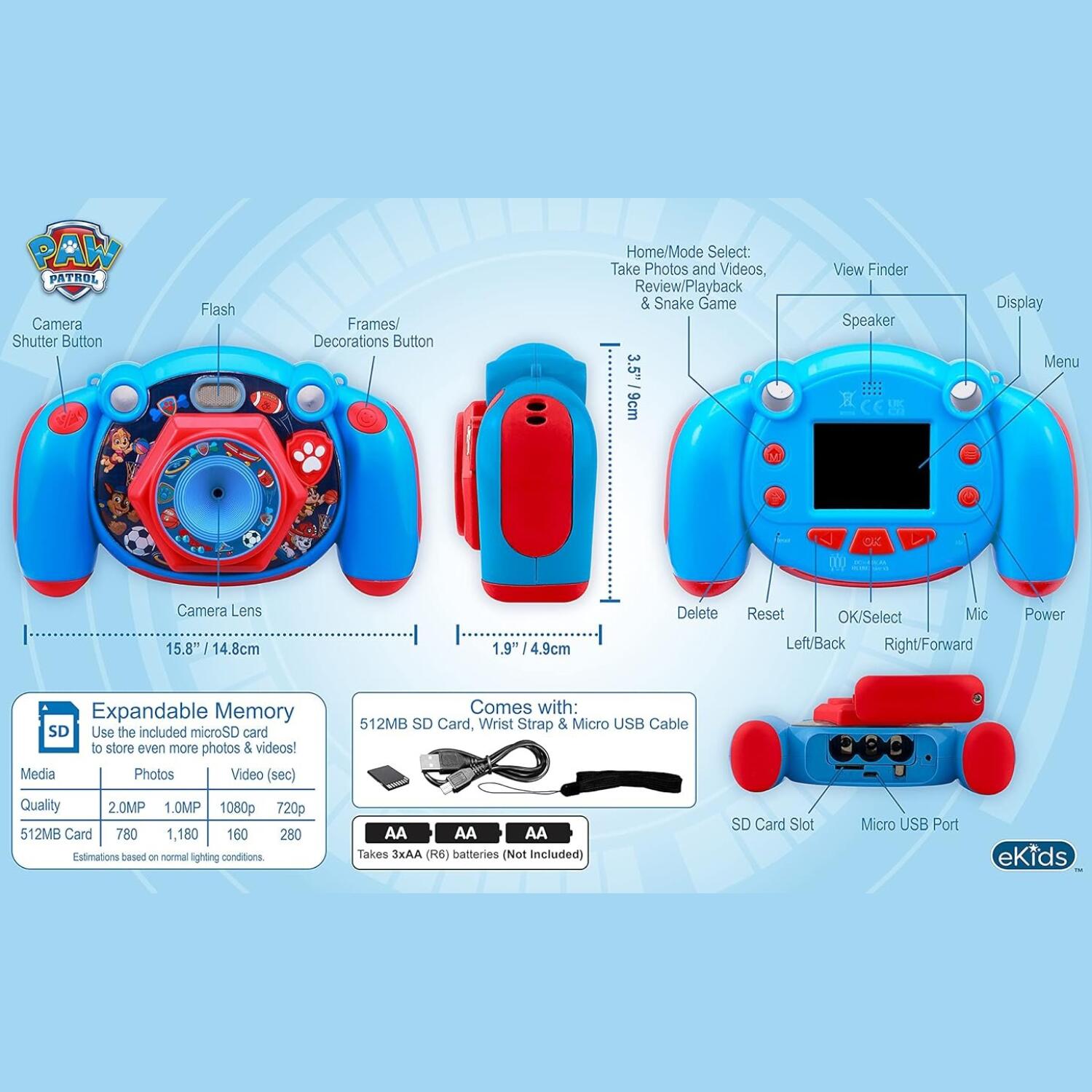Η συσκευασία περιλαμβάνει: 1 x Φωτογραφική μηχανή Paw Patrol της eKids, 1 x Λουράκι χειρός, 1 x 512MB SD Card, 1 x Καλώδιο MicroUSB για μεταφορά δεδομένων, Οδηγίες χρήστη.